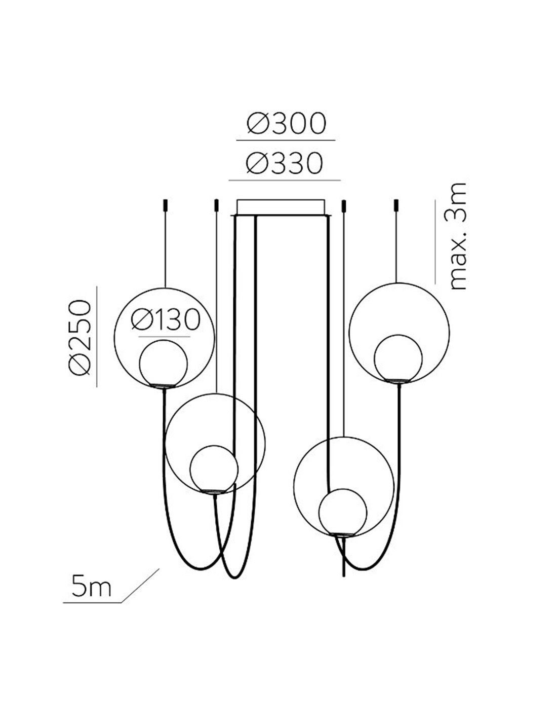 Con una estructura de pantalla de 25 cm de diámetro, pantallas en forma de bola de 13 cm de diámetro, un florón de 30 cm de diámetro, y una longitud de cable de 5 m que permite una altura máxima de instalación de 3 m, Halo es capaz de adaptarse a espacios con techos altos, proporcionando una iluminación ambiental cálida y envolvente.