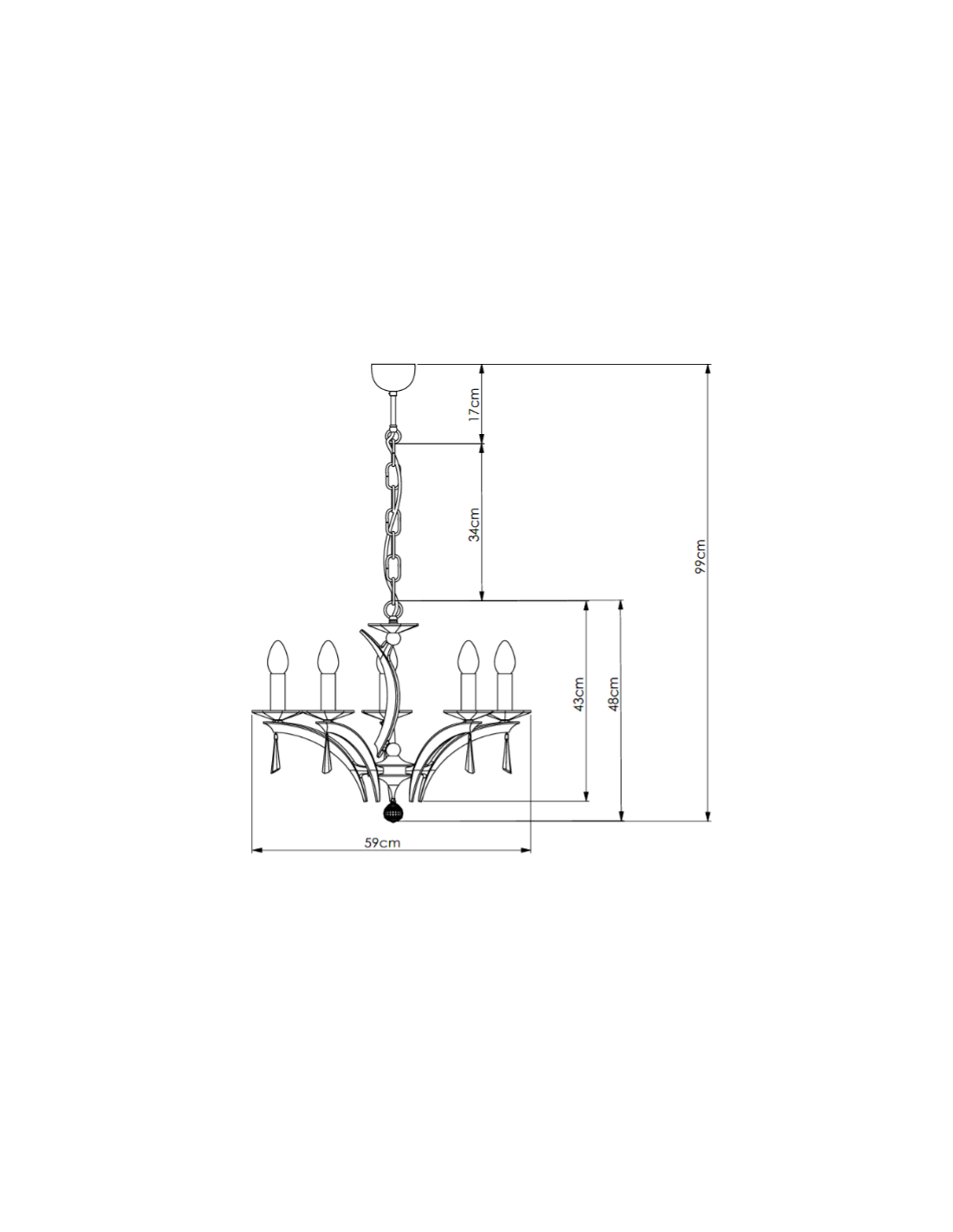 Tiene medidas de 59 cm de diámetro y un alto total de 95 cm contando la cadena que va anclada al techo, mientras que si tenemos únicamente en cuenta el aparato la altura es de 48 cm. El peso es de 8,5 Kg.