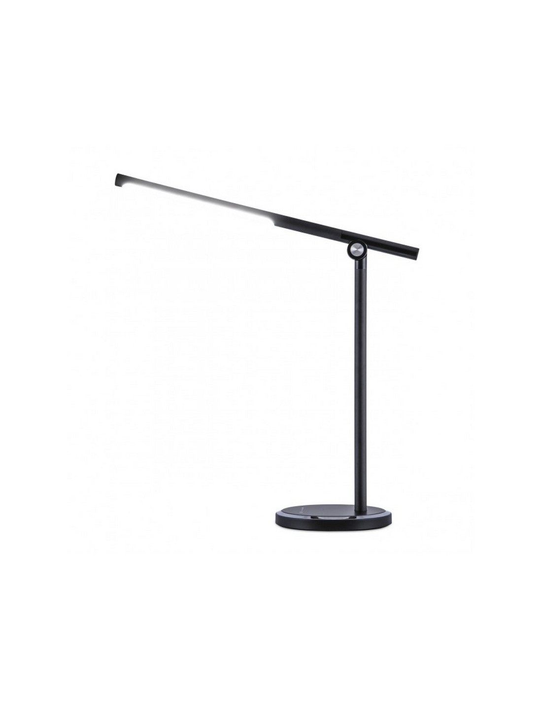 Lámpara de mesa Buros fabricada en metal y acrílico con acabado en negro. El cabezal de la lámpara se puede regular en vertical y cuenta con un puerto USB para su carga y botones táctiles en la base de la lámpara para regular la temperatura de color de la luz (3000K-6000K).