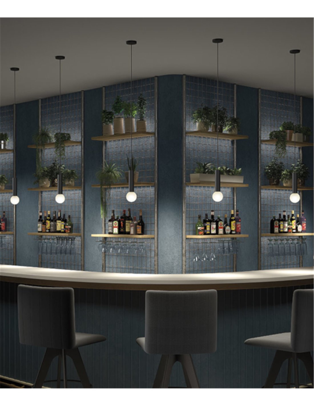 Está hecho de acero en su estructura y de difusor en el cristal. En cuanto a su acabado, esta luminaria se puede adquirir con acabado negro o en cromo, todo ello para poder adaptarse mejor a la estancia donde sea ubicada. Con respecto a esto, a pesar de cuenta con resistencia para evitar la entrada de salpicaduras de agua y humedad y es una excelente lámpara de baño, también se puede instalar en múltiples estancias como el salón encima de una mesa o en la parte superior de una barra.