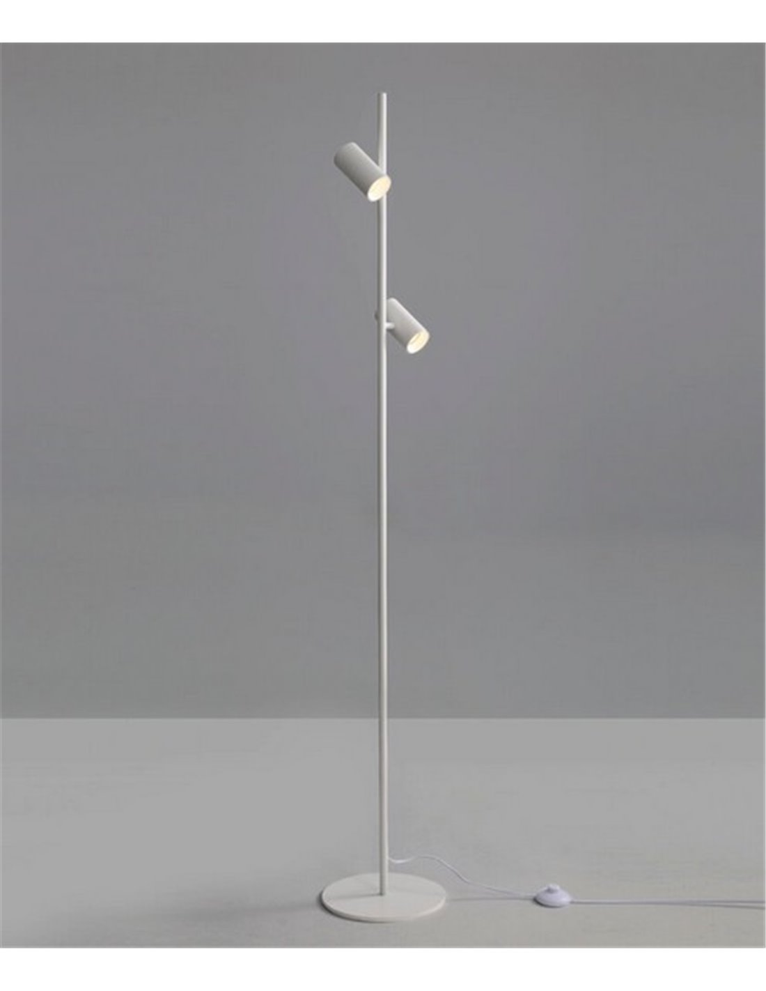 Gina es una lámpara LED de pie moderna de 161 cm de altura, disponible en dos acabados: negro y blanco. Se puede utilizar en distintas estancias de la casa, como salones para ofrecer una luz tanto directa como indirecta, pasillos para ofrecer iluminación adicional o en cualquier habitación del hogar. Una de las características principales es que dispone de dos luces orientables en 350º, lo que significa es que se puede usar como lámpara de pie de lectura. Esta lámpara de pie está fabricada en aluminio y se recomienda el uso de una bombilla LED GU10 para cada uno de sus focos.