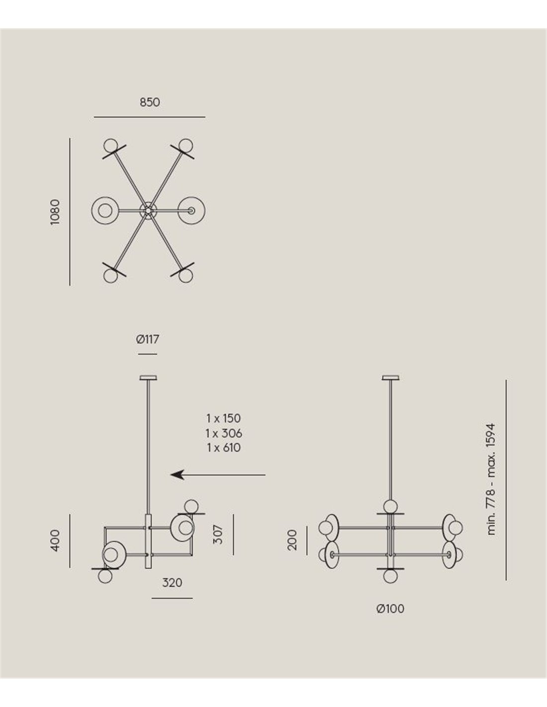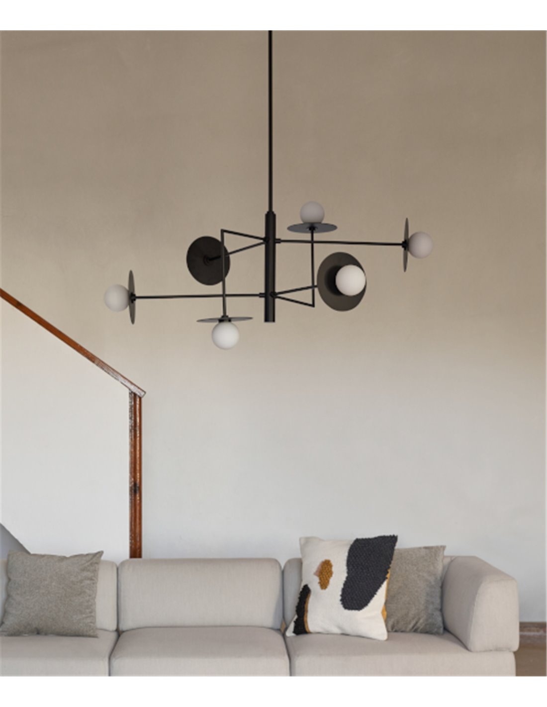 La lámpara colgante Miro está diseñada para iluminar y decorar grandes espacios. Cuenta con una estructura de acero negro mate o gris, con separación simétrica de 6 puntos de luz.