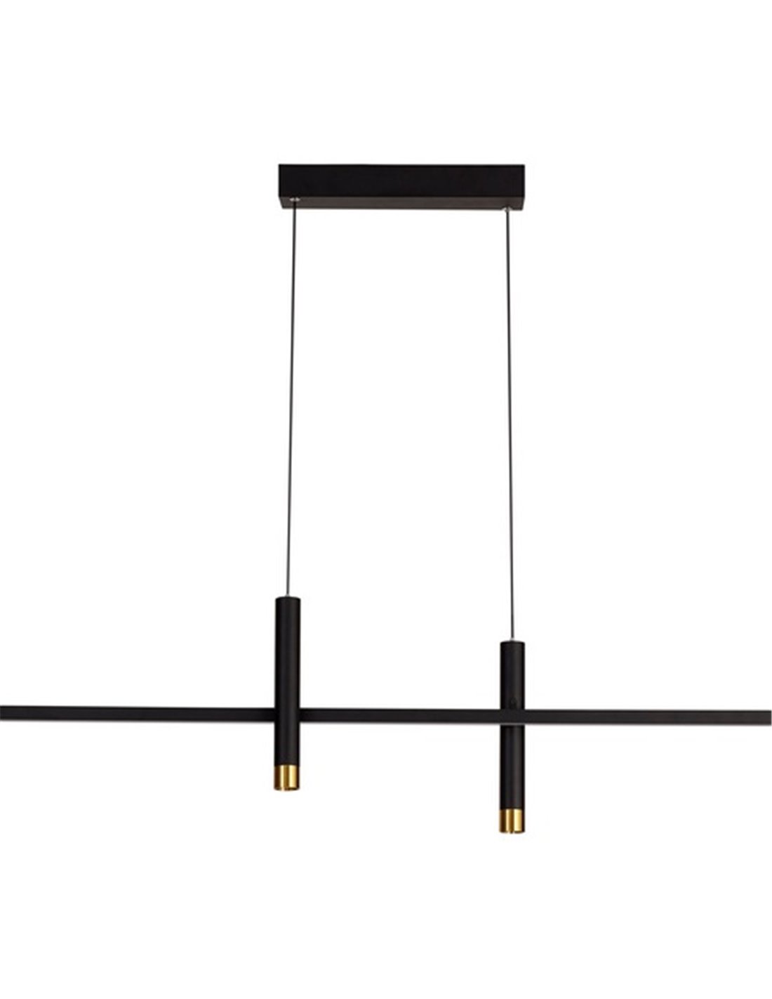 Esparta es una lámpara colgante de estilo minimalista, disponible en dos medidas. La versión más pequeña mide 103 cm de largo, mientras que la más grande, compuesta por dos piezas alargadas, alcanza un total de 153 cm, ambas realzadas por dos tubos verticales.