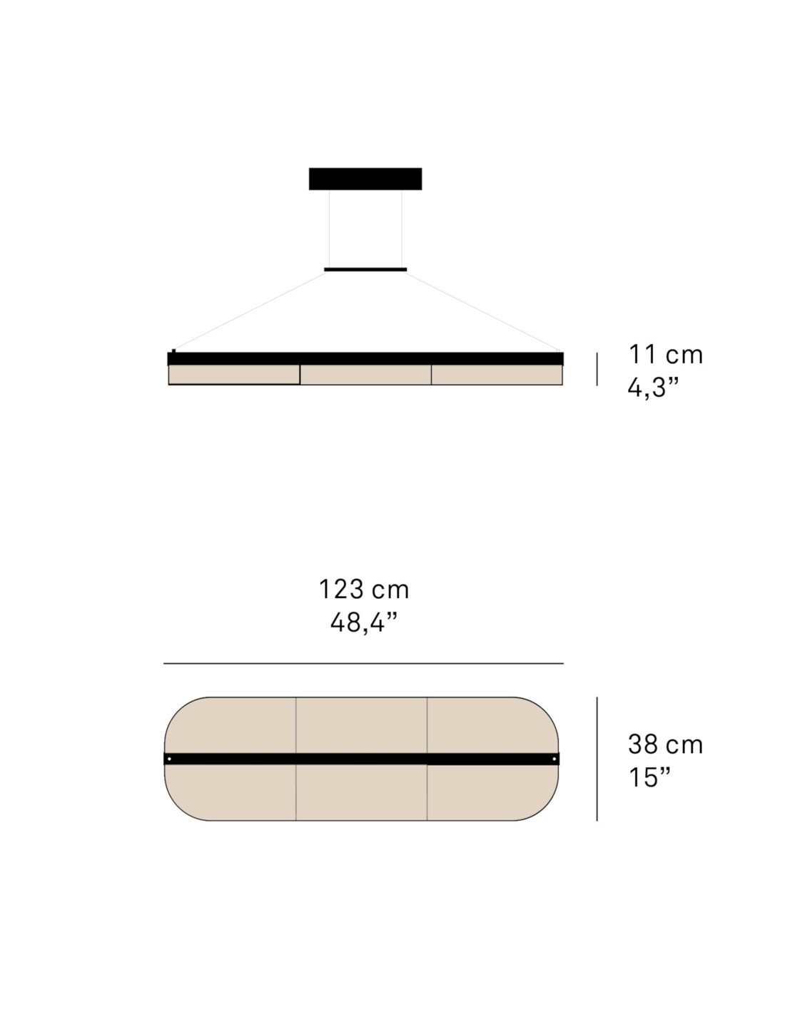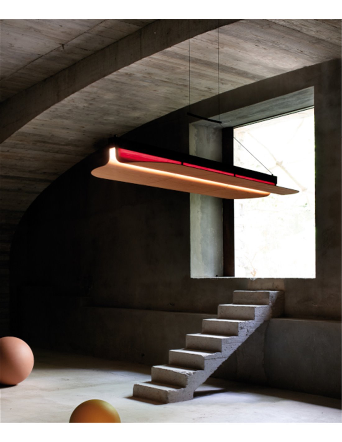 Lámpara de suspensión Omma horizonal, pantalla de madera de 123 cm de largo, LED 3000K.