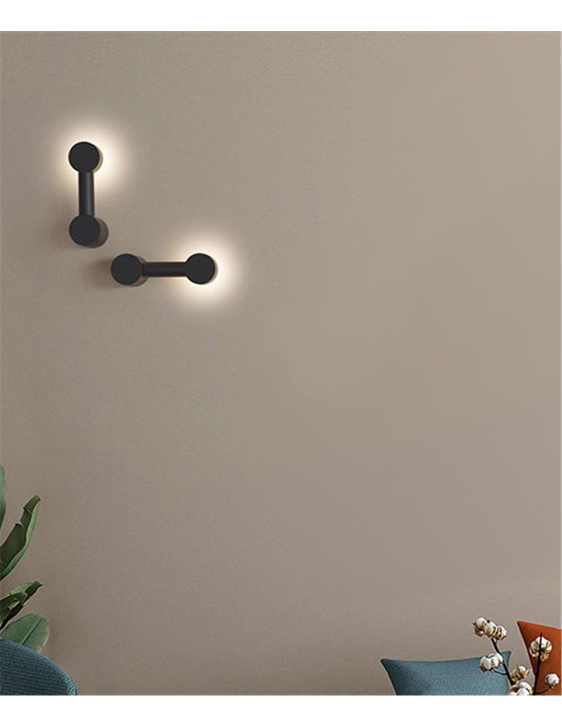 En este caso, se trata del modelo más sencillo, que consiste en una barra de hierro y un difusor redondo en el extremo de la lámpara que proyecta una agradable imagen lumínica en la propia pared. Puedes elegir entre dos colores: blanco o negro, lo cual da cierta flexibilidad en términos de estilo y diseño.