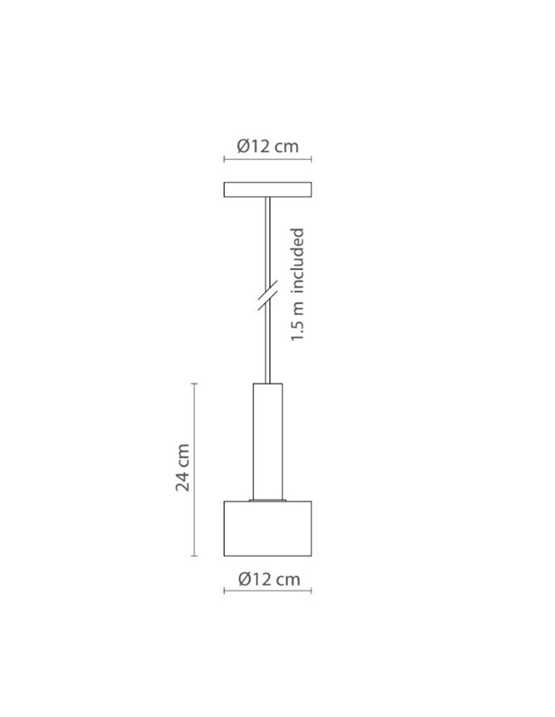Esta lámpara de suspensión está disponible en dos tamaños: la versión más pequeña mide 12 cm de diámetro y 24 cm de alto, mientras que la más grande tiene un diámetro de 30 cm y una altura de 22 cm. Ambos modelos cuentan con un cable de 150 cm, que se puede acortar para regular la altura.