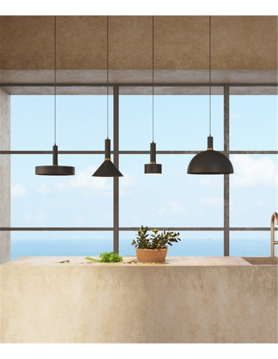 Renata es un conjunto de cuatro colgantes versátiles que se pueden combinar o utilizar de manera individual para lograr un diseño de iluminación único y personalizado. Está disponible en colores clásicos como negro o blanco, y su apariencia destaca por sus formas geométricas limpias y su sutil detalle dorado, que añaden un toque de elegancia.