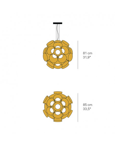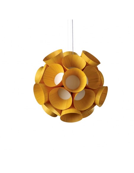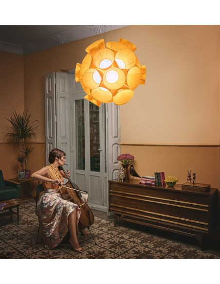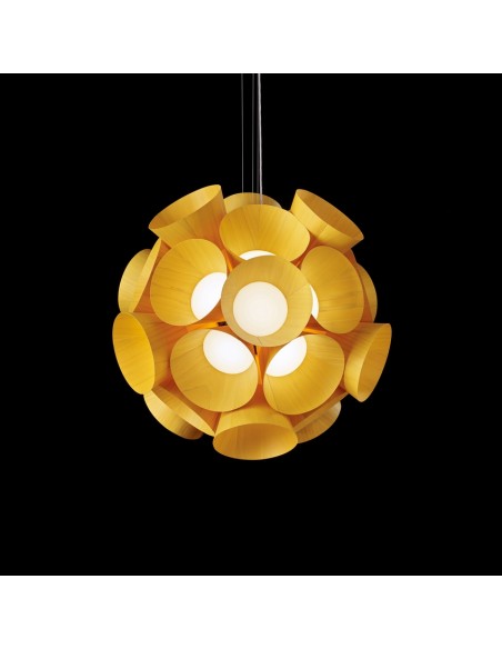 Teniendo un parecido con su homónimo en flor, la gran lámpara de techo de suspensión DANDELION de Burkhard Dämmer es una composición resplandeciente de muchas flores individuales. De forma individual, cada ramillete en forma de embudo de la lámpara parece brillar solo, pero visto en conjunto hace saltar la chispa de la flor DANDELION. Los ramilletes están hechos con chapa de madera y colocados uno al lado del otro, se levantan y caen desde el centro del DANDELION. El efecto es sorprendente, cada embudo de luz se fusiona en un conjunto brillante. DANDELION fue galardonado el prestigioso premio alemán “Design Award 2017”. Las medidas de esta espectacular lámpara son: 85 cm de diámetro y 81 cm de altura y la fuente de iluminación es Led COB 31 x 4 W 3000K en su versión regulable manual y regulable por bluetooth.