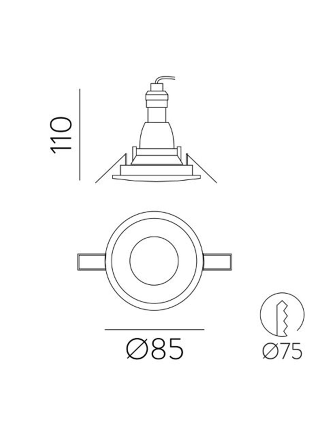 Su diámetro mide 8,5 cm y la profundidad total es de 11 cm. Su fuente de luz es 1xGU10 LED que no incluye bombilla.