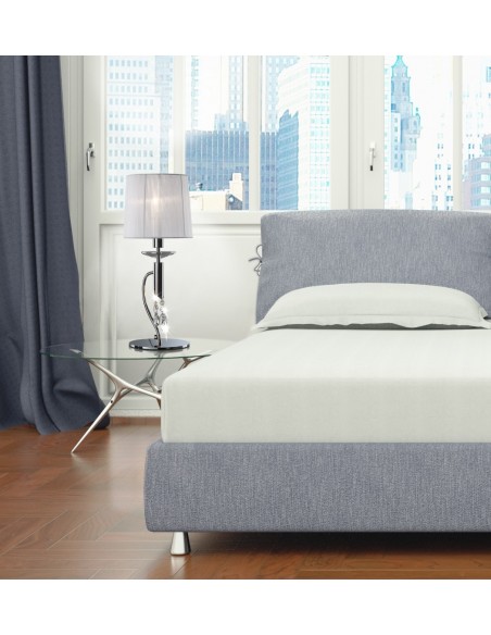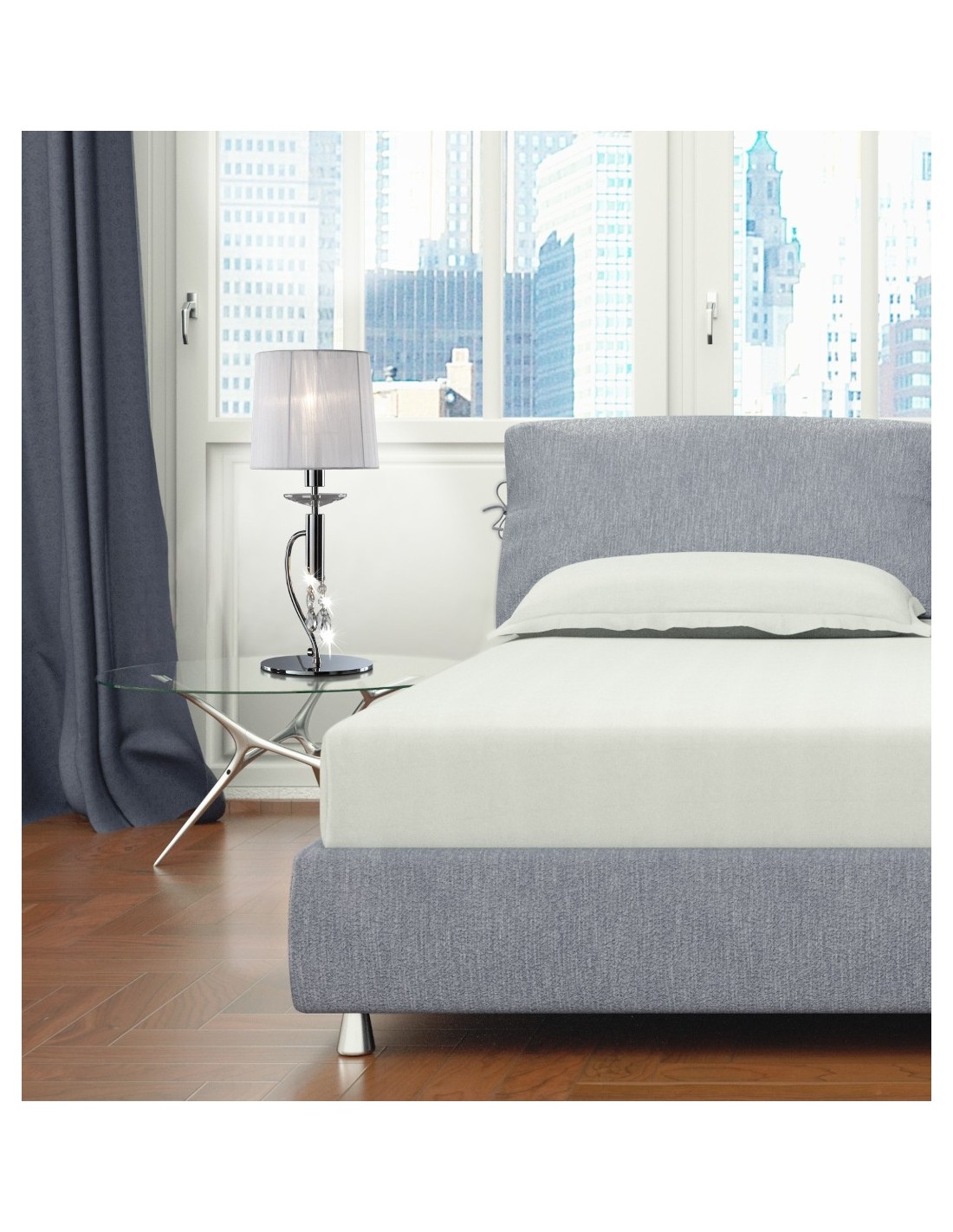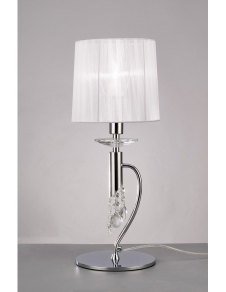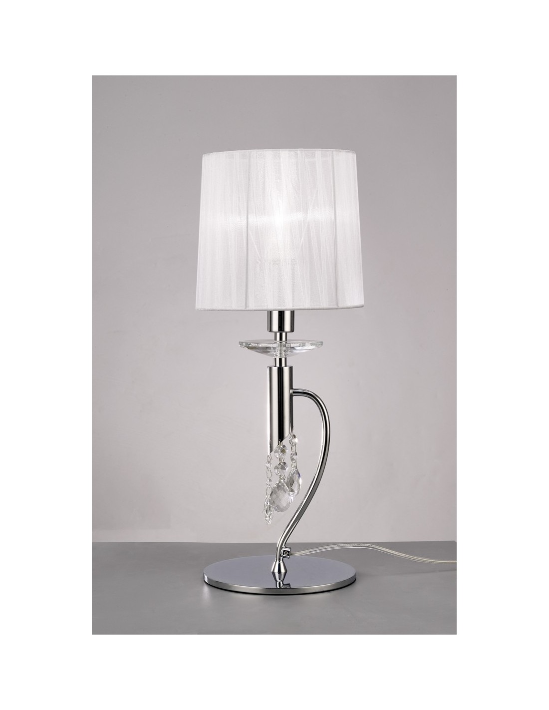 La lámpara de mesa 'Tiffany' es una elegante luminaria cuyo diseño corresponde a Jose Ignacio Ballester. Perteneciente a 'Mantra iluminación', se trata de una luminaria de aspecto clásico que combina la tela, el metal y el cristal para crear una bella lámpara que quedará estupendamente en el dormitorio próximo a la cama o en salón-comedor. Disponible con el acabado en cromo que le da un color plateado o con el acabado en cuero, tiene medidas de 49 cm de alto, 20 cm de ancho y un peso de 1.91 Kg. Precisa dos bombillas: una E27 20W para la parte superior y otra G9 LED para la zona inferior situada en la zona con adornos de cristal (no incluidas).