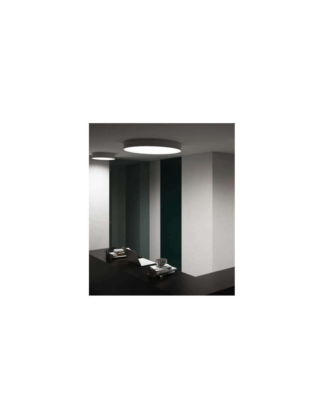 Plafo ofrece tres opciones dimensionales, cada una adaptándose de manera hábil a diferentes necesidades. Puedes seleccionar entre sus tres tamaños: 40 centímetros de diámetro (34W, 3860 lm), 60 centímetros de diámetro (75W, 8690 lm) u 80 centímetros de diámetro (142W, 16400 lm). Todas las versiones disponibles cuentan con la temperatura de color de 3000K, ofreciendo así una luz cálida neutral.