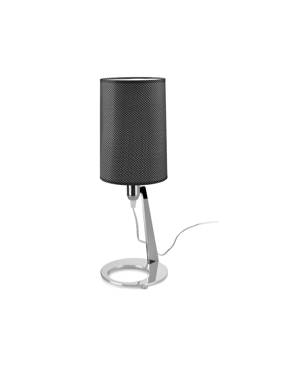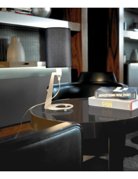 Se trata de una lámpara que refleja elegancia al combinar distintos elementos que la forman. Con la pantalla cilíndrica negra realizada en tela y con la estructura circular de acero acabado en cromo en la base, es ideal para situarla en cualquier mesita de noche o incluso en un estudio como lámpara adicional que acompañe a la iluminación principal añadiendo al ambiente un efecto sofisticado y a la vez moderno. Las medidas de este producto son: 48 cm de alto y 17 cm de ancho y la bombilla recomendada es 1 X E27 PL 15W (no incluida). Cuenta con un interruptor situado en el cable. Existe una versión de aplique de pared de esta lámpara de sobremesa.