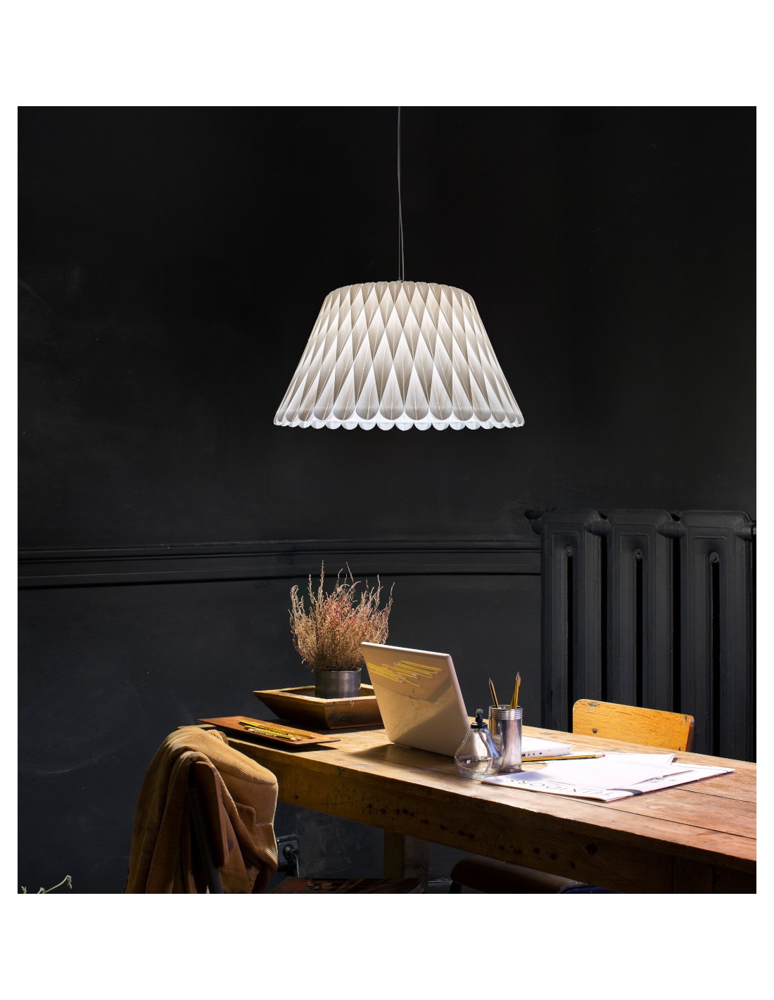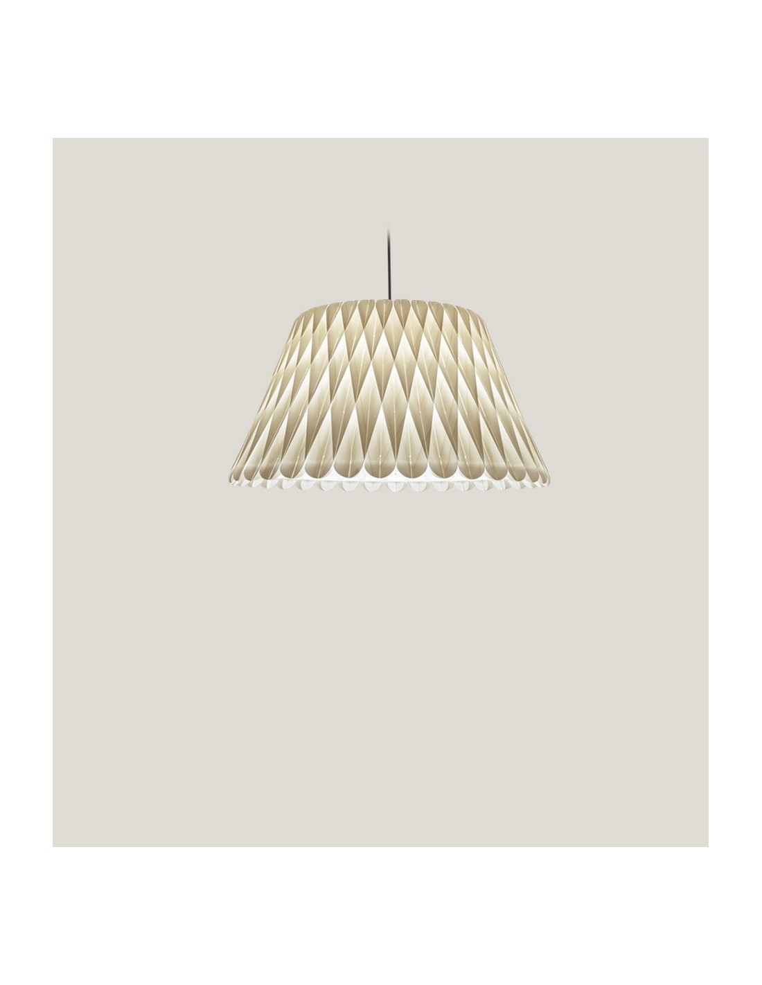 Esta impactante lámpara de techo no deja de ser una gran pieza creada por Ray Power que ha intentado adjuntarle formas tridimensionales a través de las chapas de madera natural. Lola se distingue por su pantalla cónica con un patrón geométrico que se acentúa cuando se ilumina. Es una lámpara que atrae las miradas, tanto por su estética, como por las dimensiones y la forma de difundir la luz. Ideal para ambientes exigentes y estancias más transcurridas como salones y comedores. Esta lámpara colgante está disponible en dos tamaños: Ø 56 cm y Ø 88 cm. Lleva integrada la fuente de luz LED crown 500mA, 1632lm/crown 3000K (tamaño mediano) y LED crown 1400mA, 4210lm/crown 3000K (tamaño grande). Dispone de un cable de acero negro de hasta 2 metros.