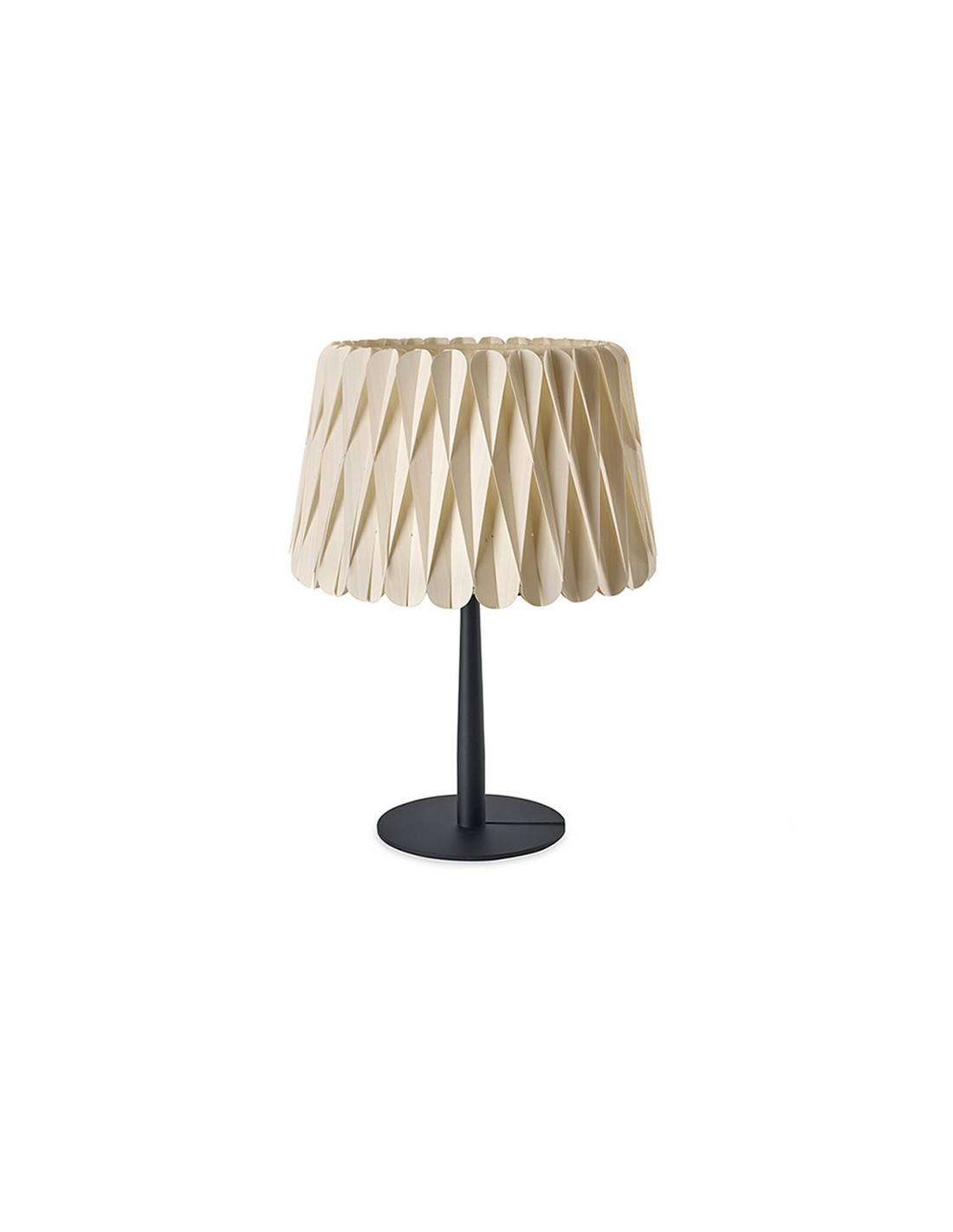 La moderna y atrayente lámpara de mesa Lola se distingue por su pantalla en forma cónica disponible en dos tamaños: Ø 31 cm y Ø 39 cm. La pantalla está formada por elegantes chapas de madera colocadas minuciosamente para proyectar la luz de manera mágica y sensual. Esa suave proyección se hace indispensable para ofrecer luz ambiental de gran calidad a las estancias. Además de su impactante pantalla, la lámpara de mesa Lola está formada por un pie metálico y por un marco acrílico. El cable negro de 145 cm lleva integrado un interruptor con regulación. La fuente de luz recomendada es: LED Globe DIM 11 W max (no viene incluida).
