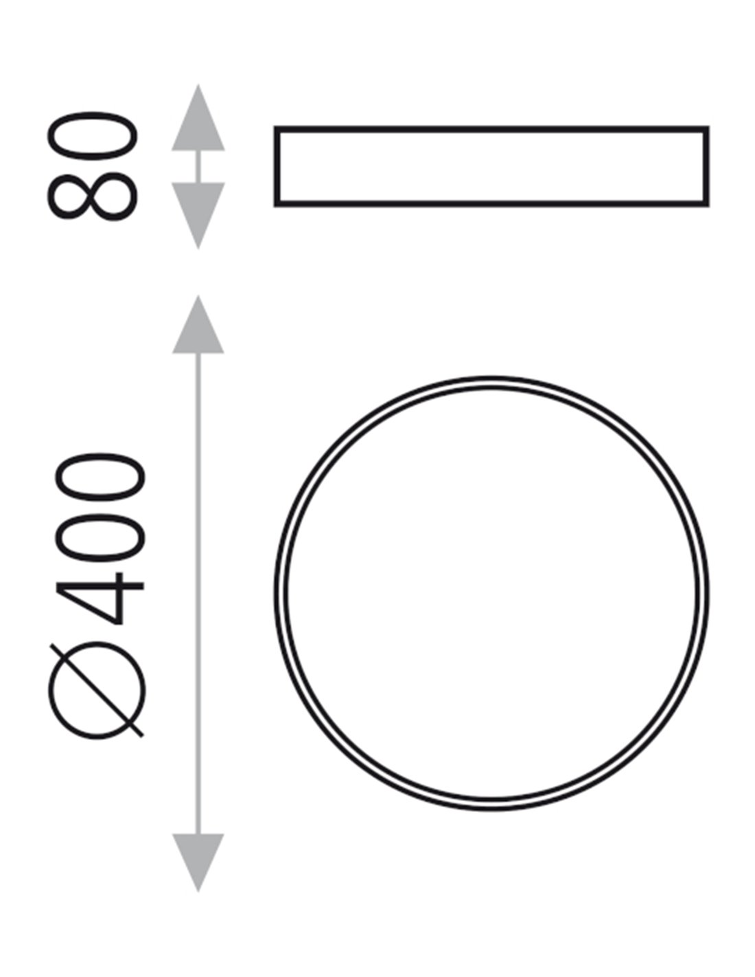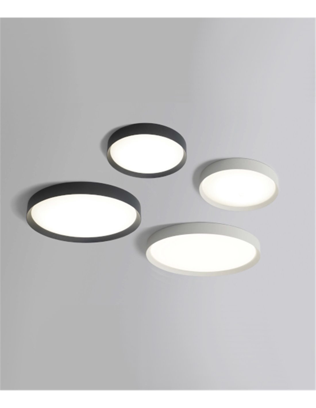 Su instalación es apta para las viviendas o para espacios comerciales, de ocio o espacios públicos. Su estructura fabricada en metal se encuentra disponible en dos colores (blanco y negro texturado) y en dos tamaños diferentes: Ø 40 cm y Ø 60 cm.
