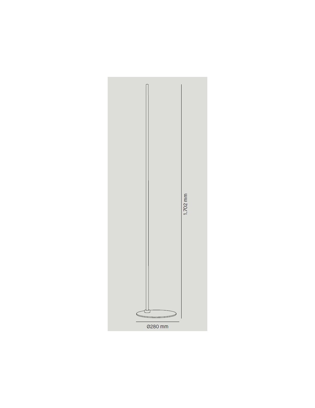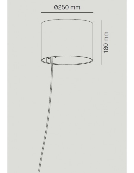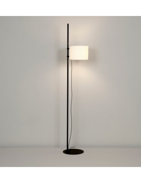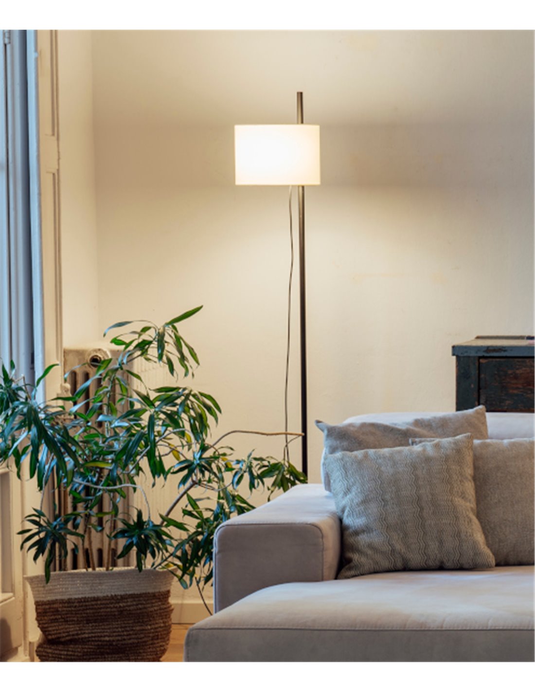 Es una lámpara de pie compuesta por una base de acero de acabado negro o visón (a elección del cliente) unida a una pantalla de poliéster con estructura de film rígido de PVC, la cual permite regular la altura, la posición y la rotación en un ángulo de 360º. Se recomienda como pie de salón gracias a su versatilidad y dimensiones, ya que esta luminaria alcanza los 188.2 cm de altura y tiene un diámetro de 25 cm en la pantalla y 28 en la base. La fuente de luz (no incluida) va con interruptor incorporado para bombilla E-27 LED 12W 1100lm 2700K, la cual emitirá luz cálida y creará ambientes propicios para el descanso y relax. Este producto incluye únicamente una pantalla, aunque también se encuentra disponible una versión con dos pantallas.