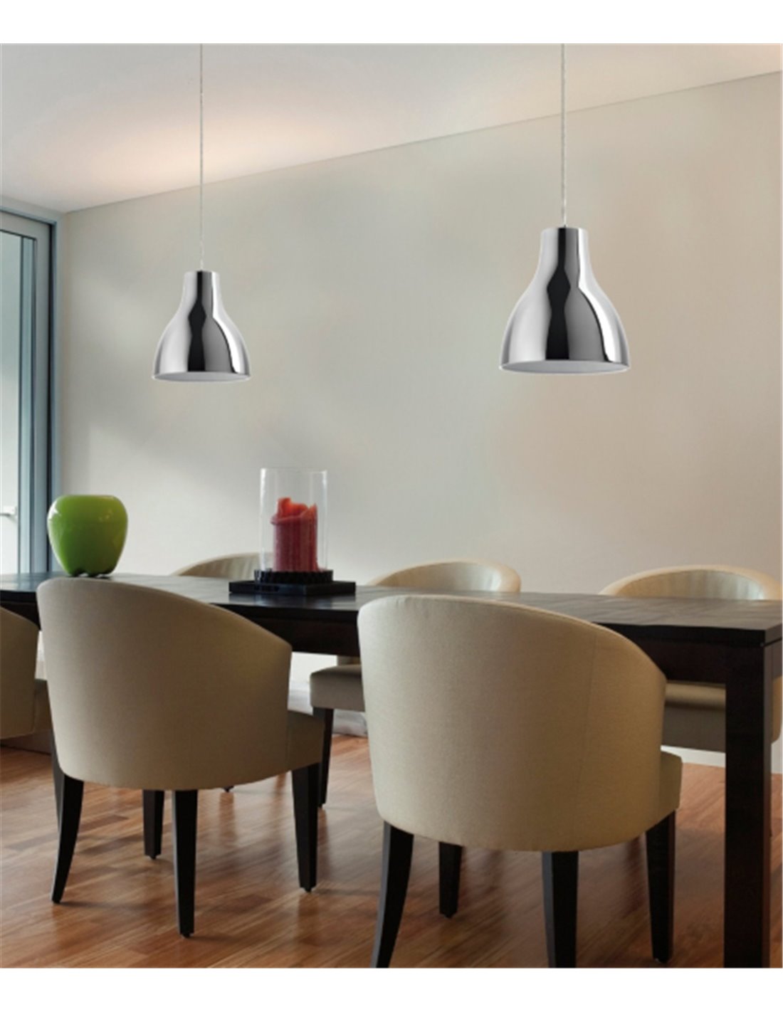 The CAMILA collection includes a selection of pendant lamps made of steel and configured through three finishes: white, chrome and copper. The CAMILA pendant light has a flared design and a maximum extension of 135 cm. This ceiling lamp has been designed from a E27 lamp holder that makes it compatible with several light sources. We recommend the use of LED lamps as a light source for this luminaire.