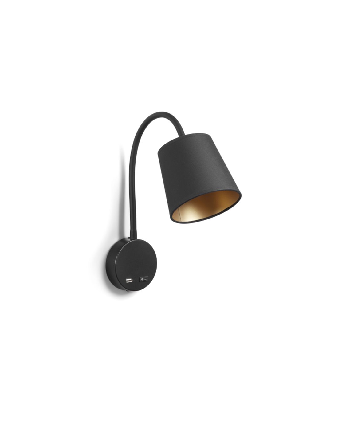 The elegant and functional design of this lamp makes it ideal for bedrooms. It can be placed on the wall next to the bed for easy reading at night. The black and gold colour of this wall lamp allows it to easily adapt to any decorative style, adding an elegant and sophisticated touch to the room. The base of this lamp is very functional because it incorporates a switch and a USB port, which allows you to connect electronic devices with ease.