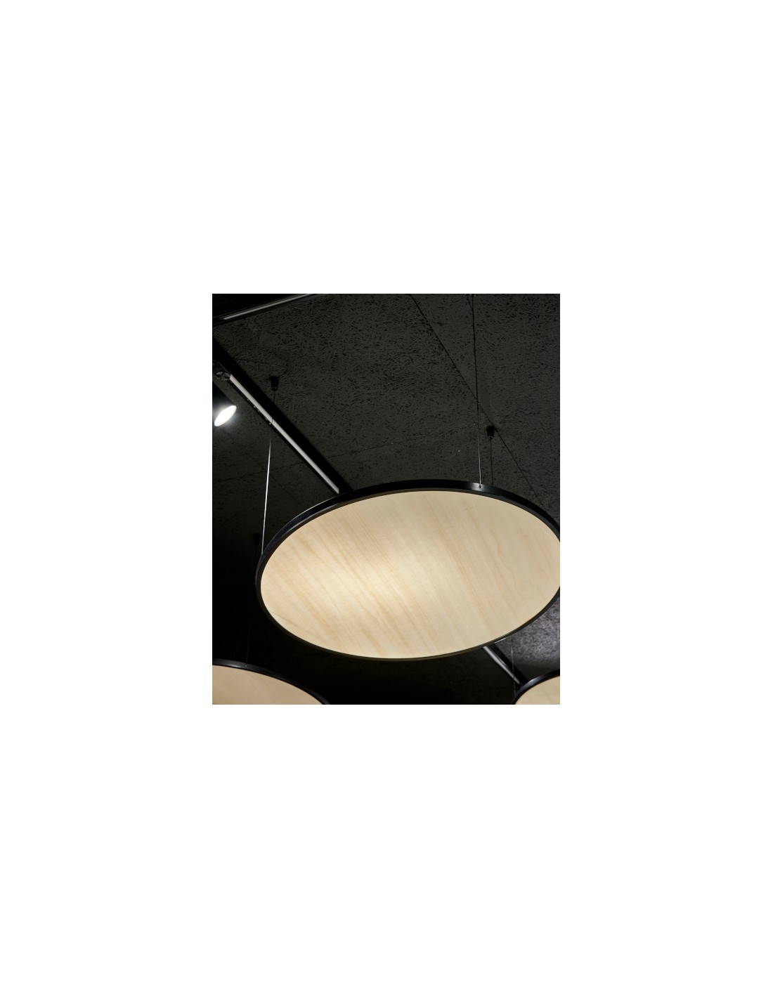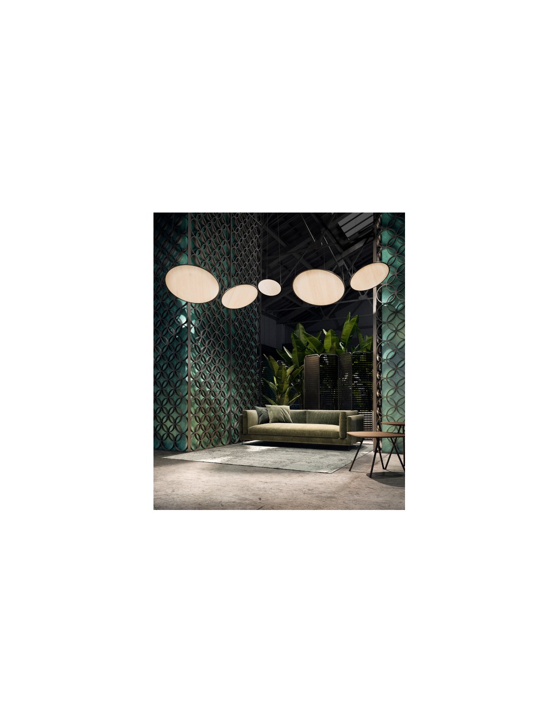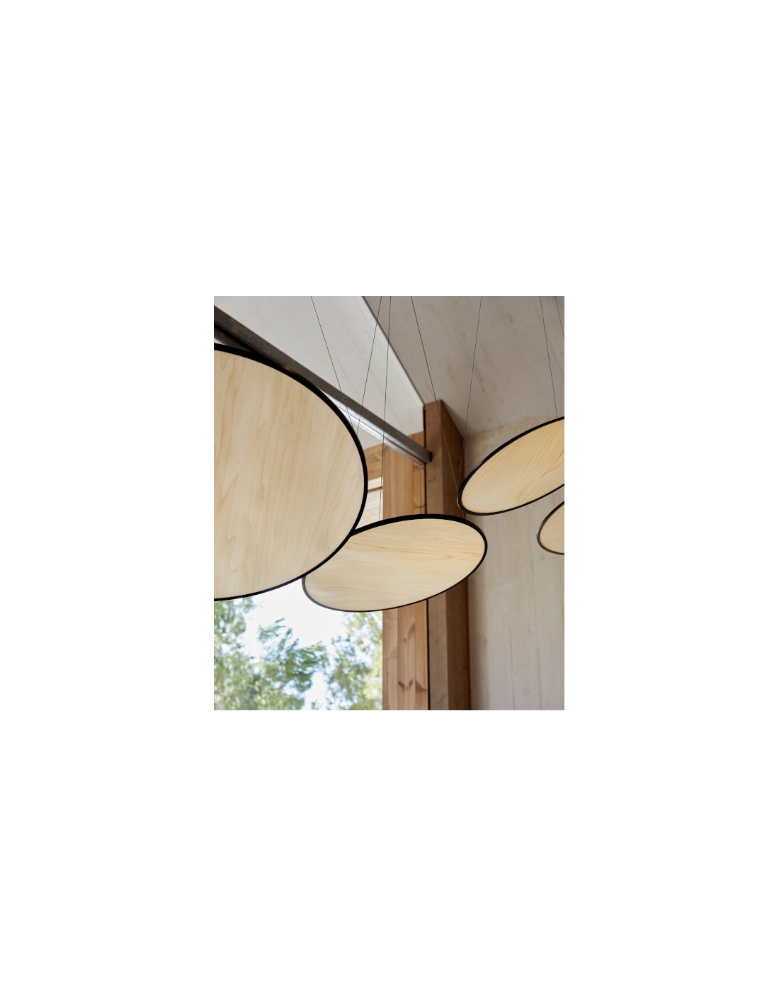 Suns is a decorative panel, reminiscent of a celestial disc, and has the function of diffusing light and dampening sound. Designed by Mikiya Kobayashi, based in Tokyo and Valencia, Suns is available in three sizes: small, medium and large. Japan is affectionately known as the "land of the rising sun", and in Suns we find a handmade circular wooden panel that is characterised by a quiet and respectful beauty, a quality inherent to Japan. Without light or electrification, the Suns panel consists of a wood veneer and a metal profile. Designed to hang at an angle, Suns is spectacular when presented in a group.