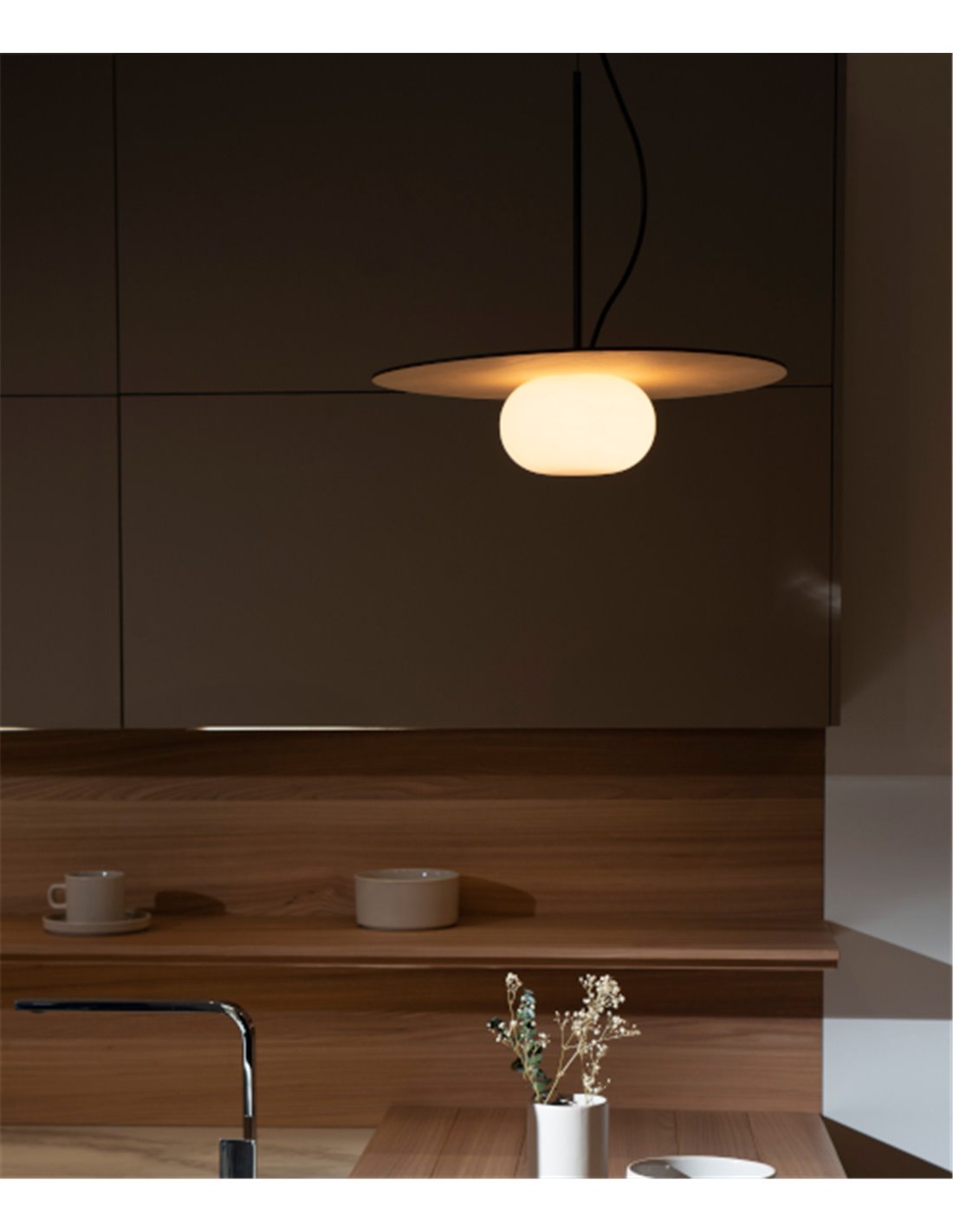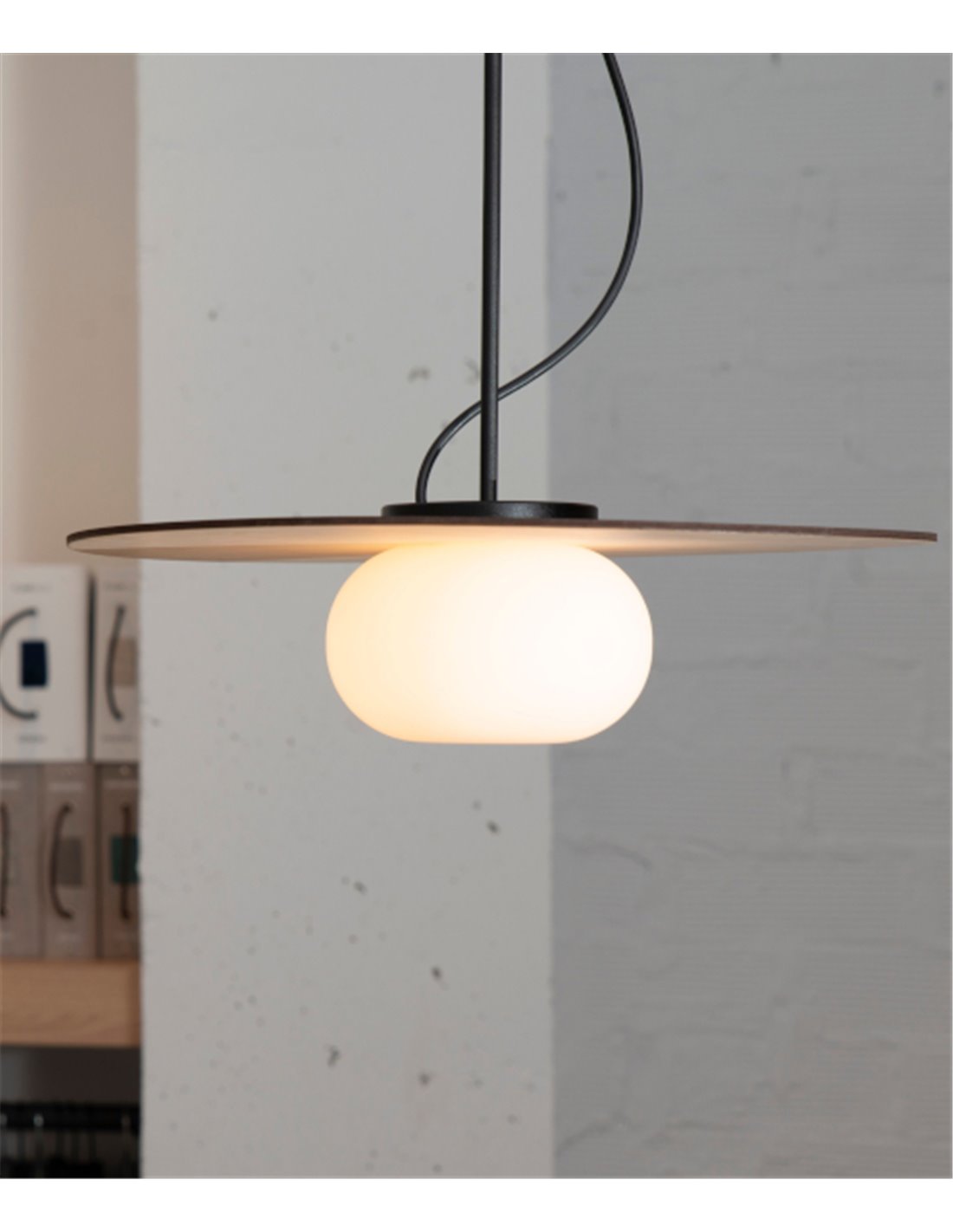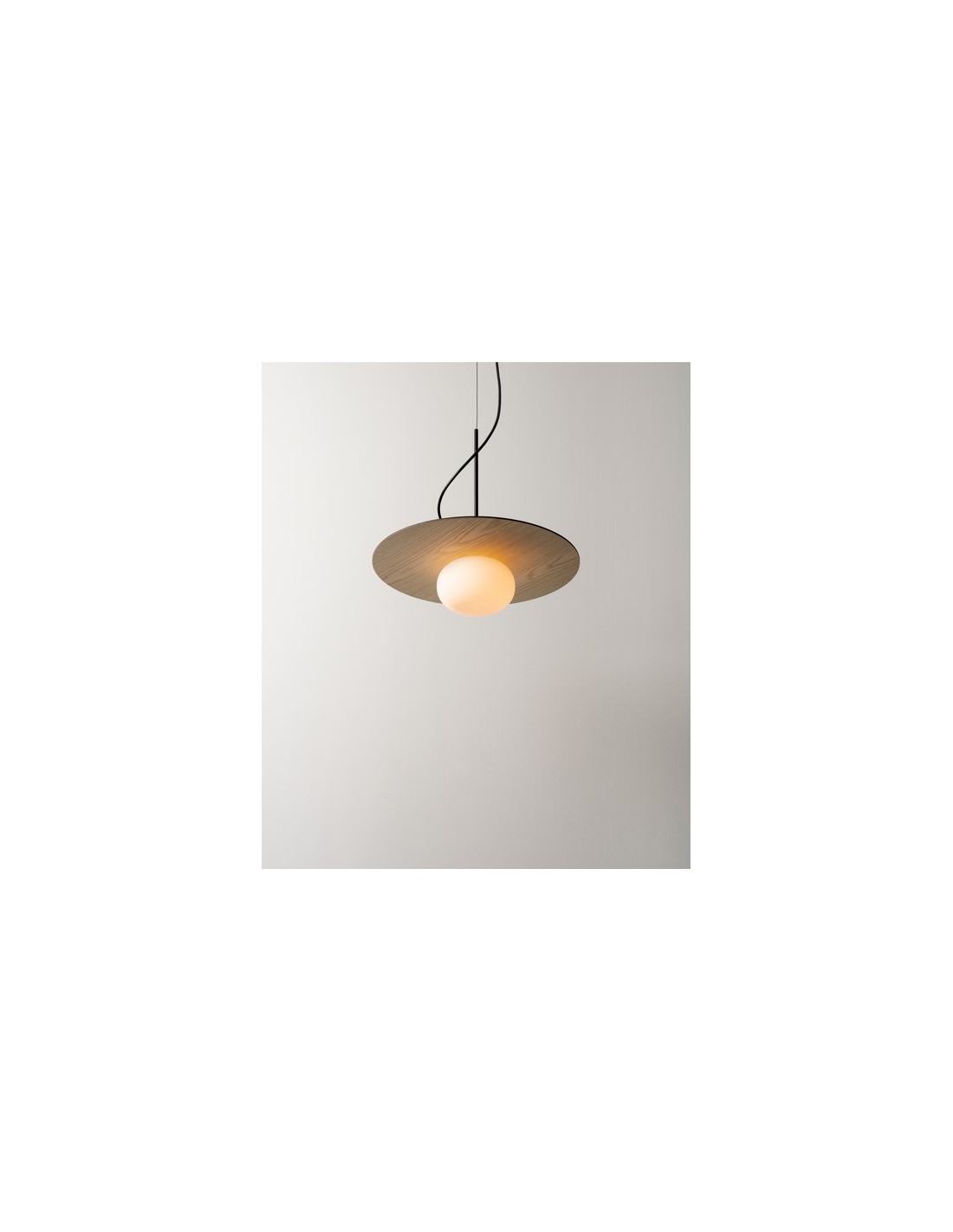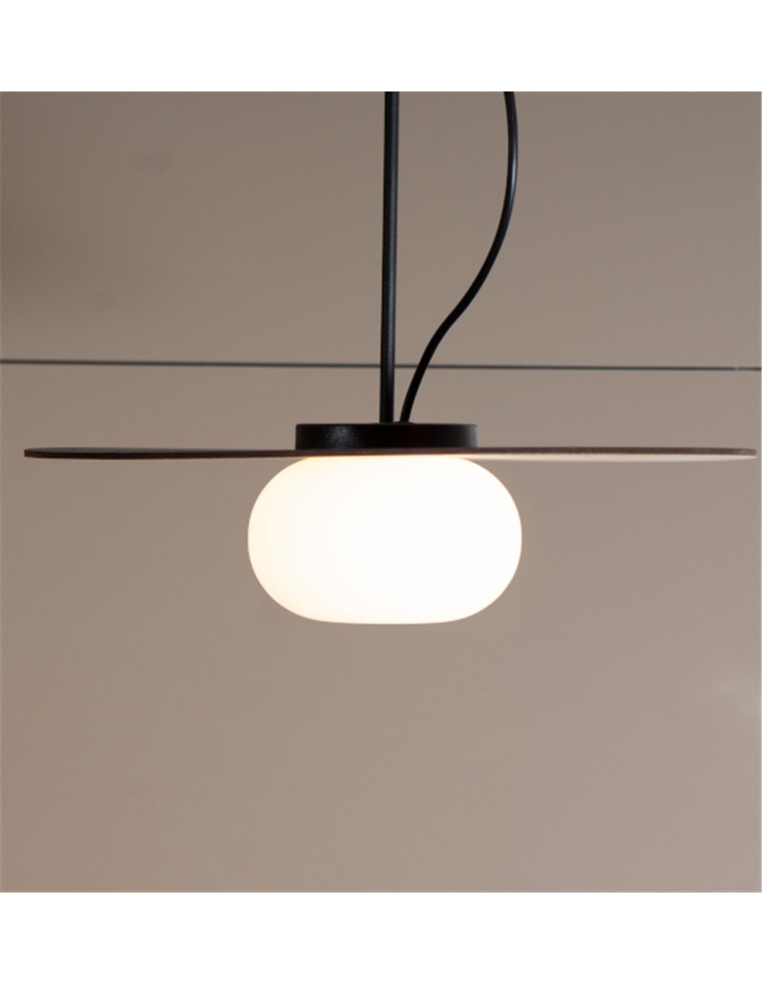 The plate is made of ash wood varnished on one side and lacquered in black on the other side. This base is reversible, which means that we can turn it whenever we want. The oval lampshade that includes a G9 lamp holder (bulb not included) is made of blown glass with an opal finish and is fused to the plate by means of an internal three-spring system.