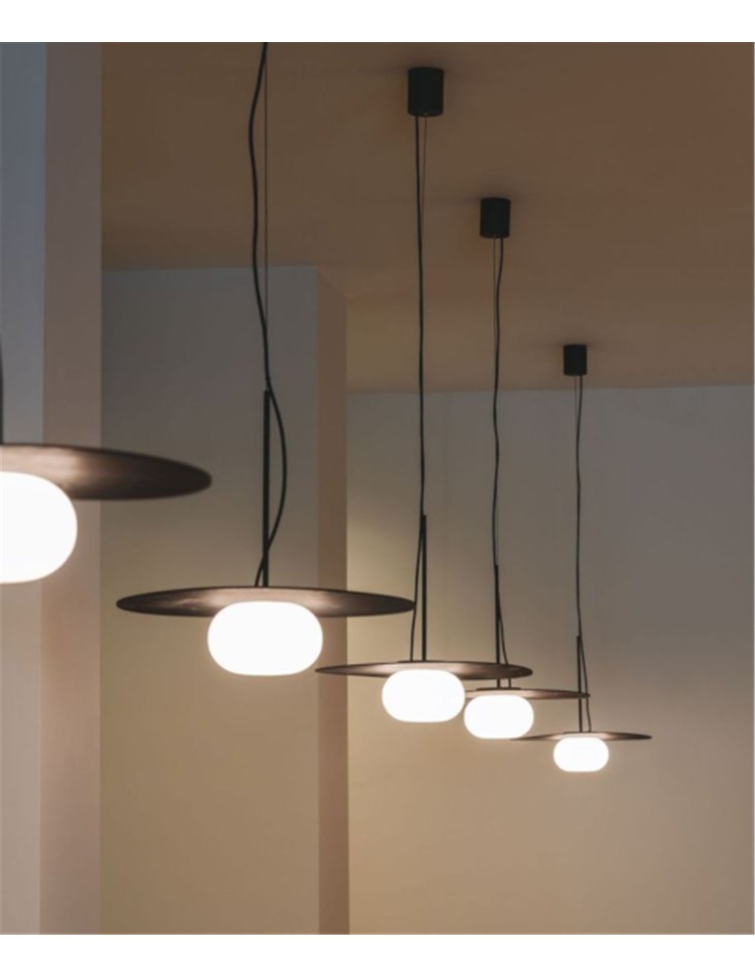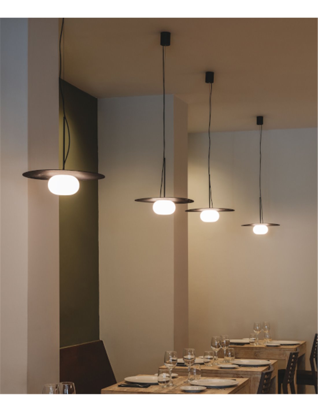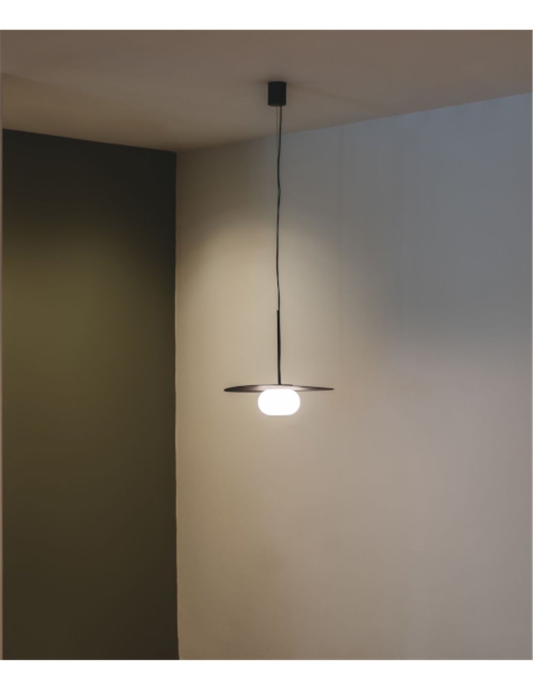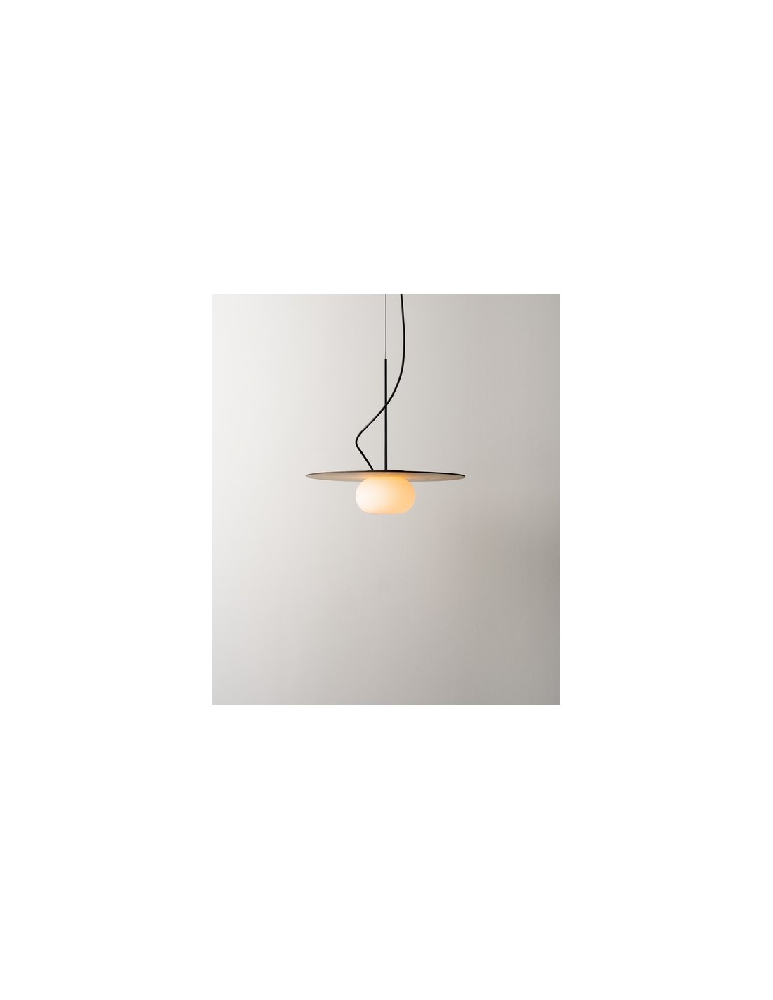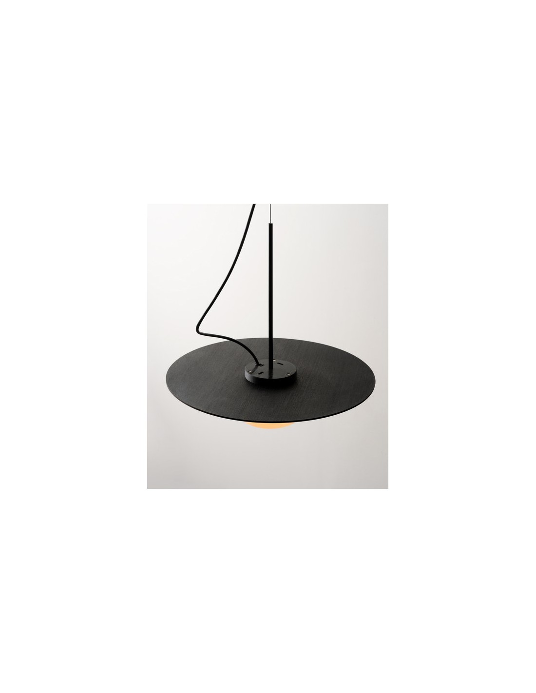 The plate is made of ash wood varnished on one side and lacquered in black on the other side. This base is reversible, which means that we can turn it whenever we want. The oval lampshade that includes a G9 lamp holder (bulb not included) is made of blown glass with an opal finish and is fused to the plate by means of an internal three-spring system.
