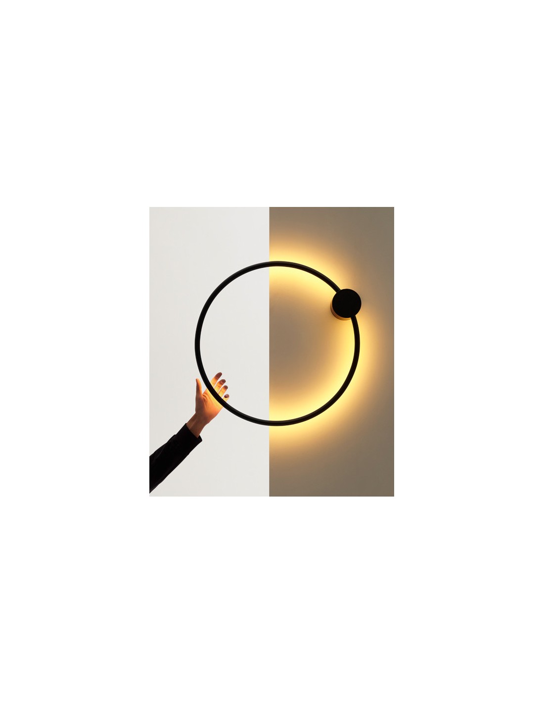 In terms of size, this modern design lamp has a diameter of 57 cm, while the piece to superimpose it on the wall has a diameter of 10 cm.