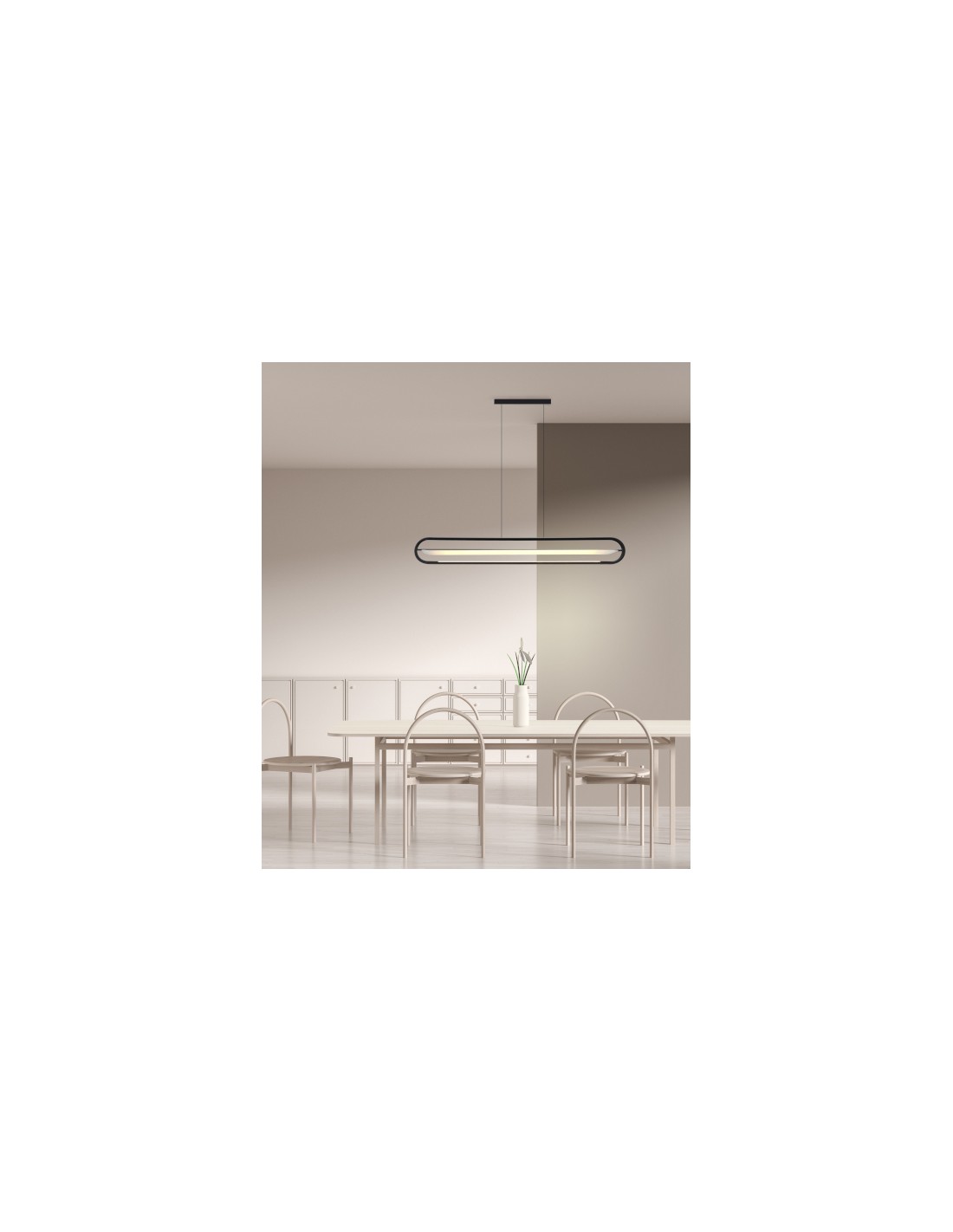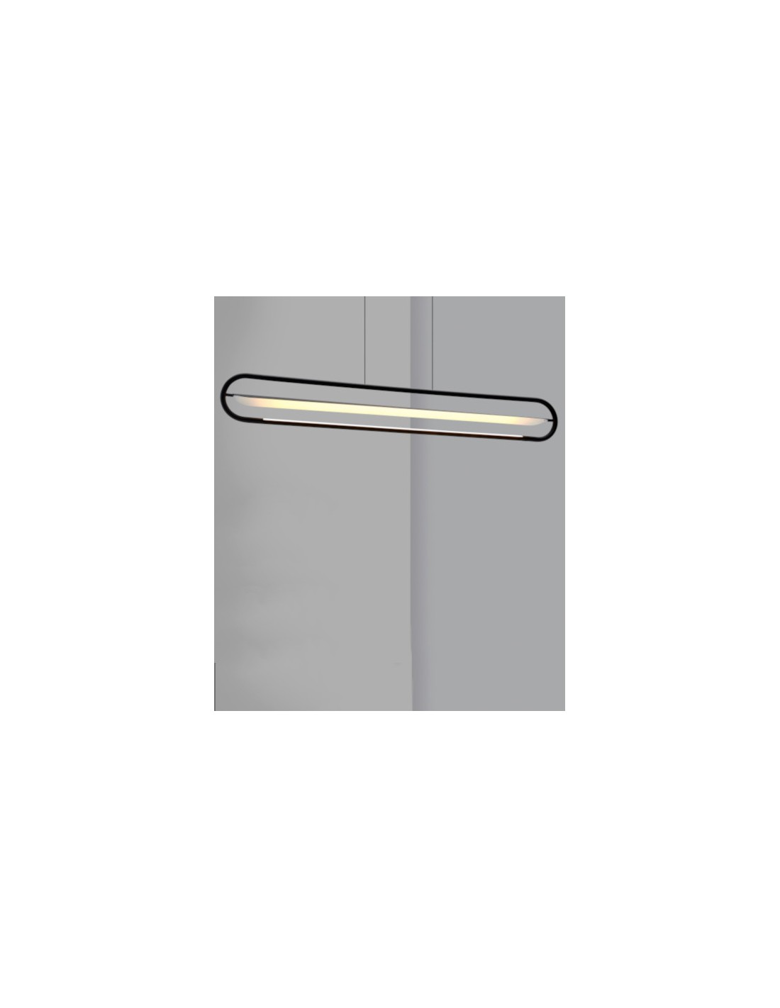 It is a black metal pendant lamp suspended horizontally. Its design makes this ceiling lamp an ideal element to be placed above a table, either in the dining room or in an office.