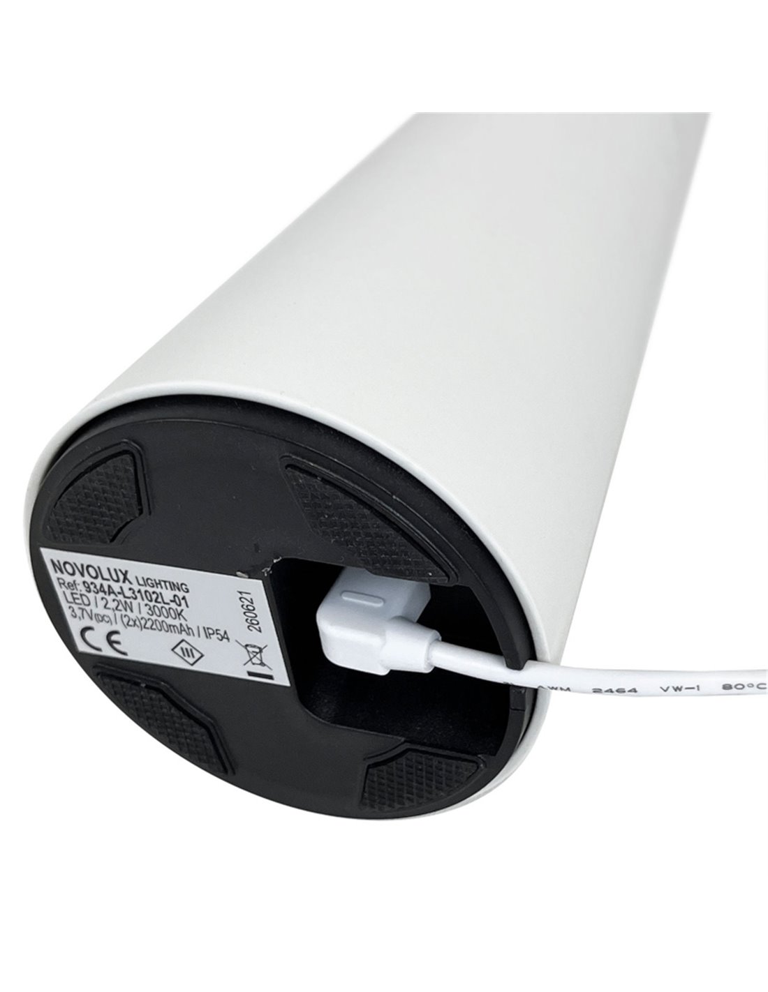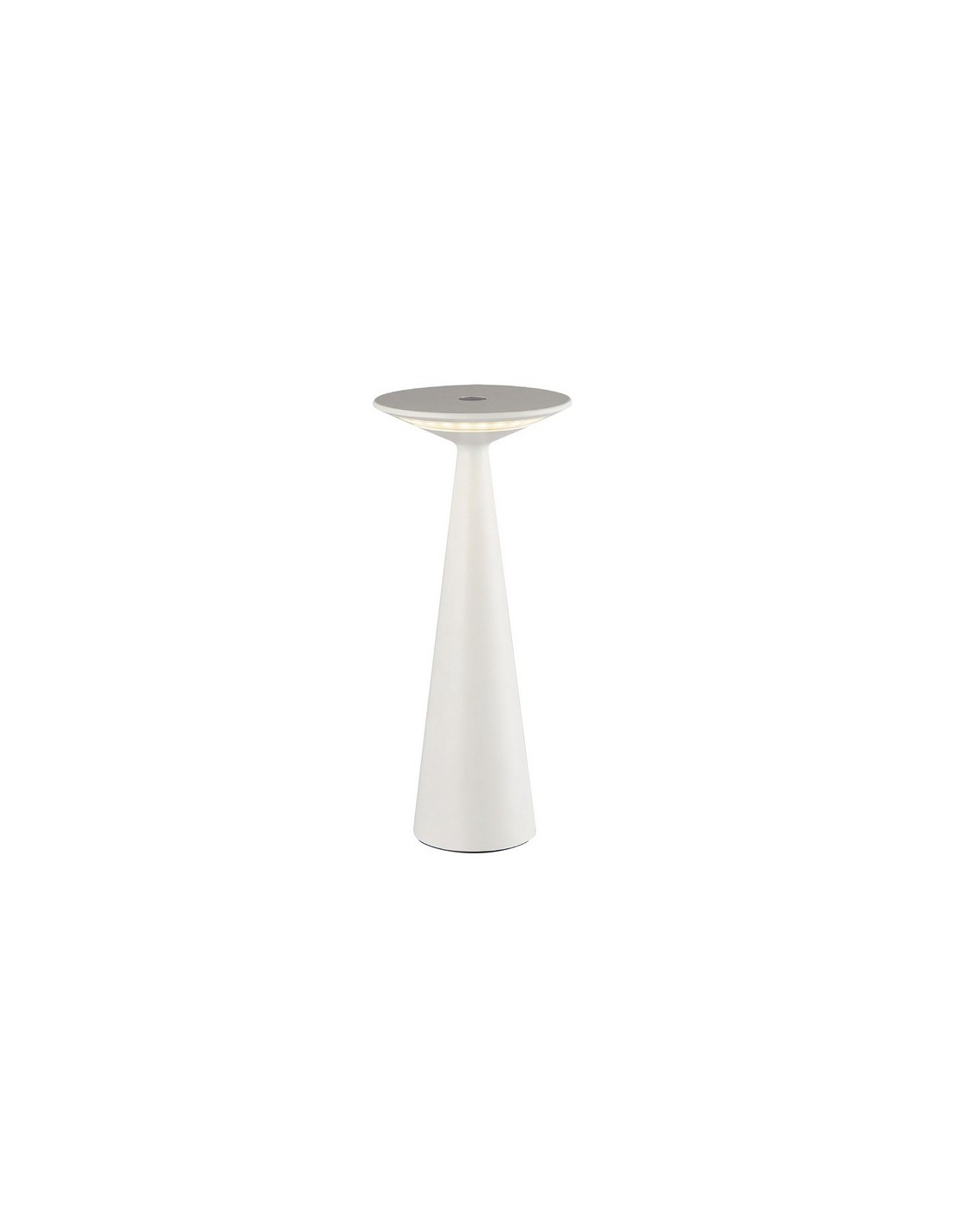 It is made of steel in white, has touch dimming (manual button to regulate the brightness of the lamp), USB charger and gives off light in a rotosymmetrical way.
