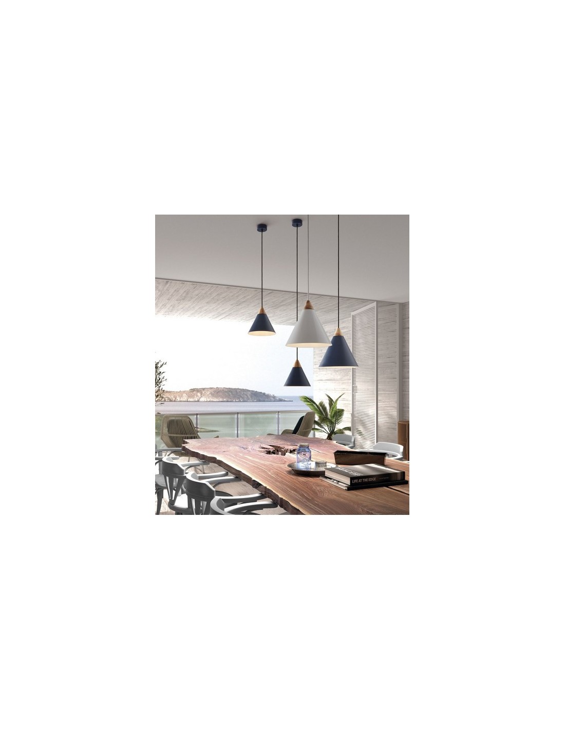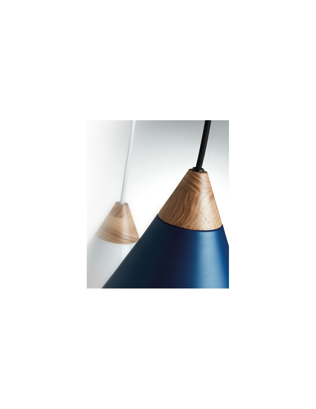 The Oda shade pendant light style stands out for its style with three finishes black, blue, and white. It is ideal for installation in dining rooms, living rooms, or bedrooms. It creates a warm and pleasant atmosphere in the environment where it is installed, thus creating an ideal everyday atmosphere. Made of steel and ash wood, this is a diffused beam design pendant light for interiors. A 60 W max. E27 bulb is recommended.