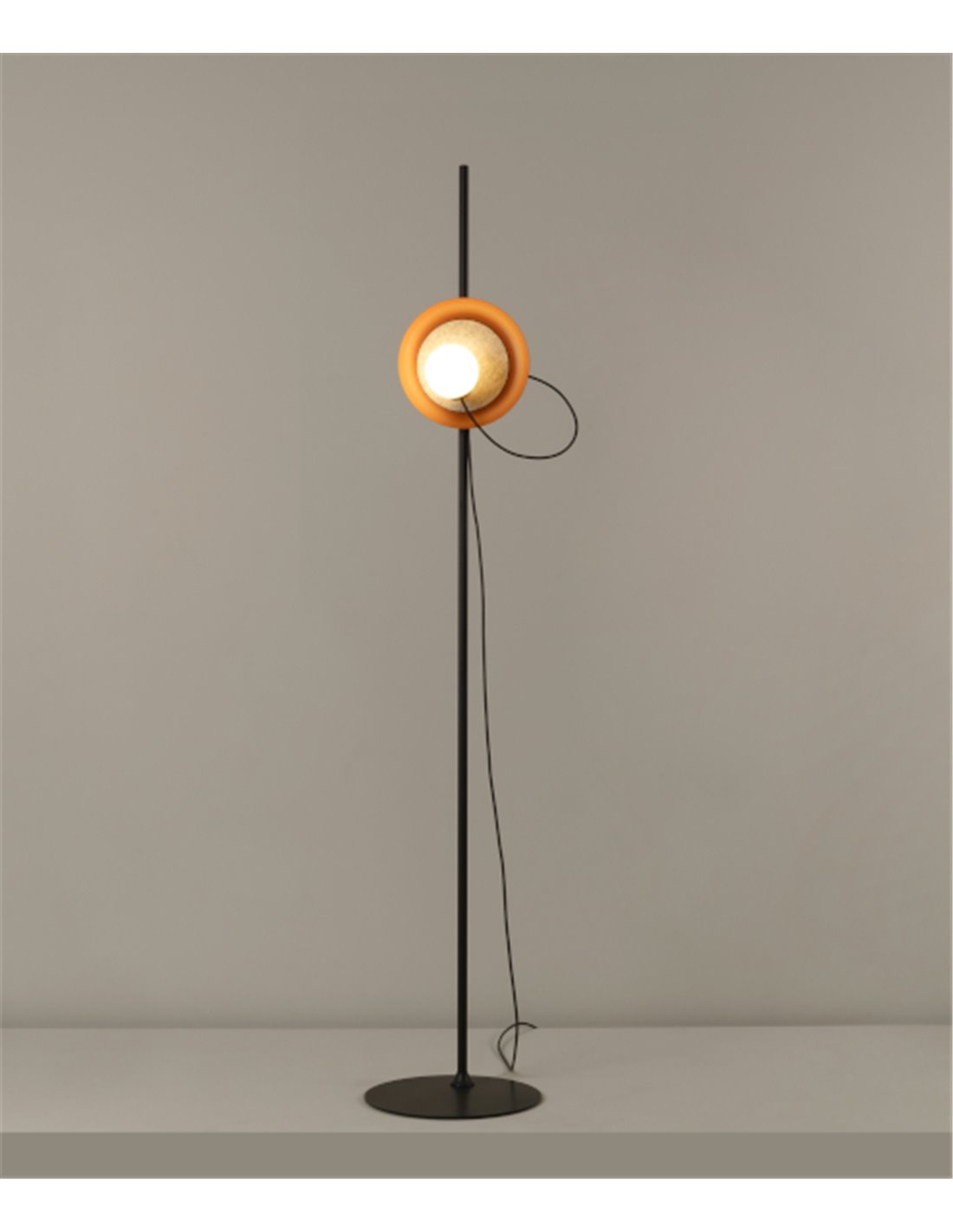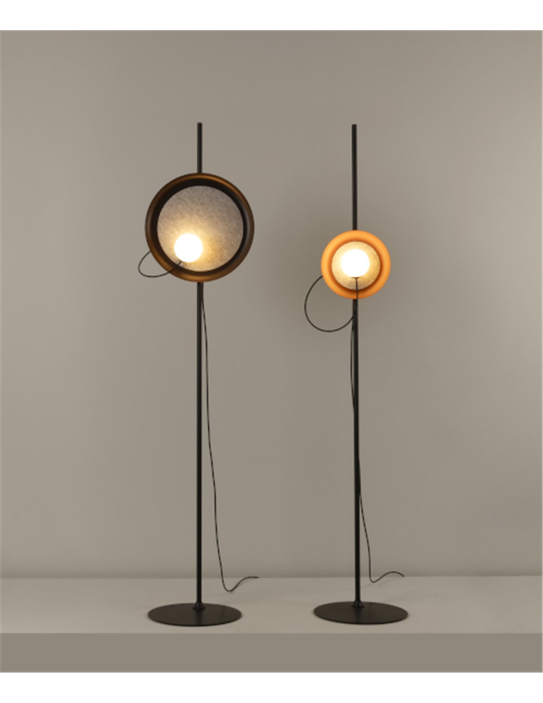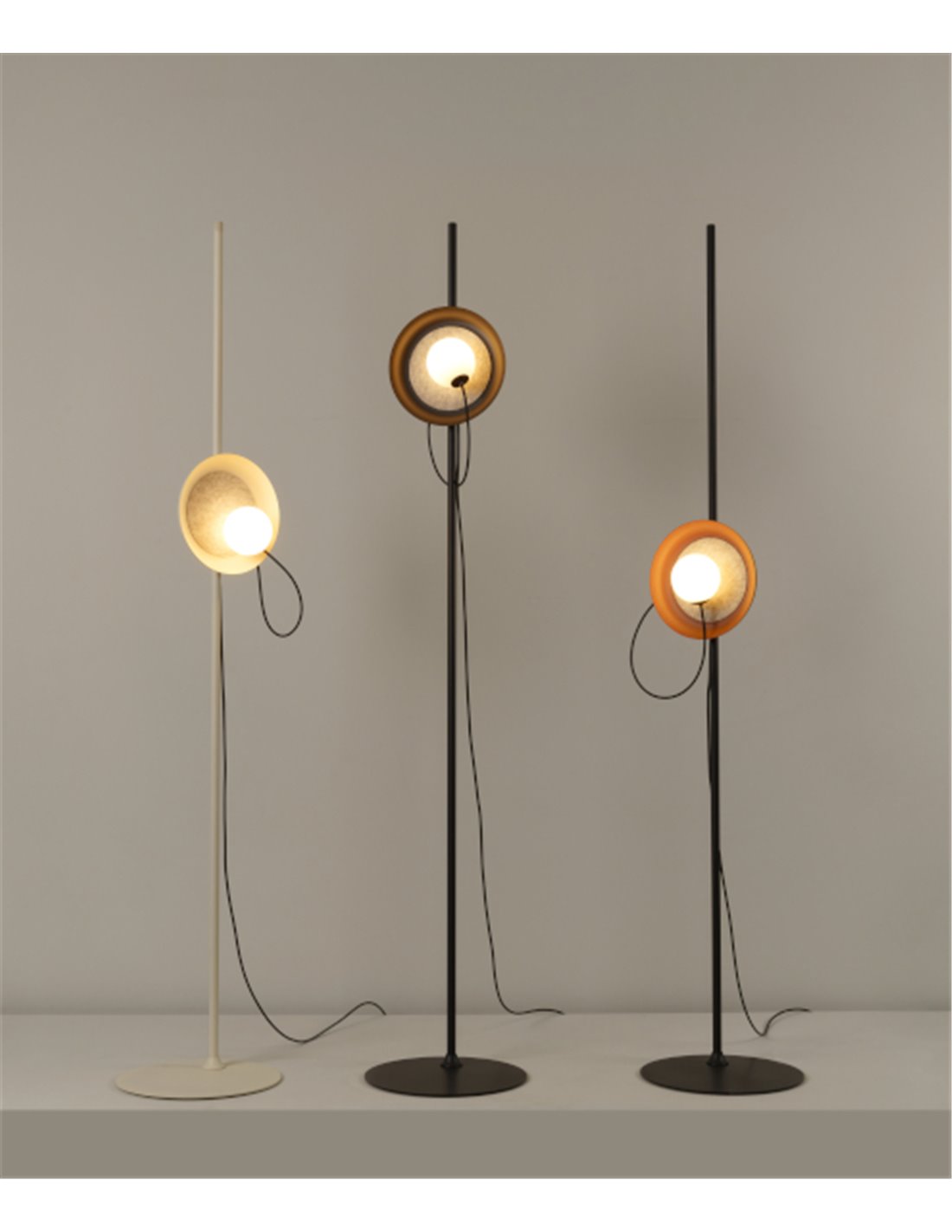 This modern living room floor lamp, designed by Jordi Jané, is available in three lampshade colors: mink, charcoal grey, and metallic copper. The various colors and versions make it perfect for contract spaces where rhythm and dynamism are desired. The lampshade is available in two sizes: 24 cm and 38.3 cm.