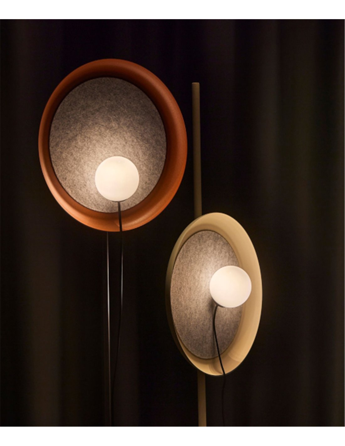 The Wire floor lamp is an exclusive piece of lighting that cleverly plays with the connection between the glass shade and the lampshade. Its lampshade moves lightly over the shade cover, which also acts as an acoustic insulator. A magnet in the lampshade generates a magnetic field that subtly magnetizes the lampshade.