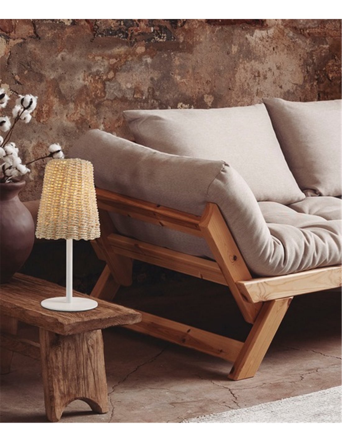 The distinctive detail is its shade, made of natural fibres that imitate the look of rattan. This material, so visually attractive, contributes to the sustainability of the product, as it is a material with a low environmental impact.