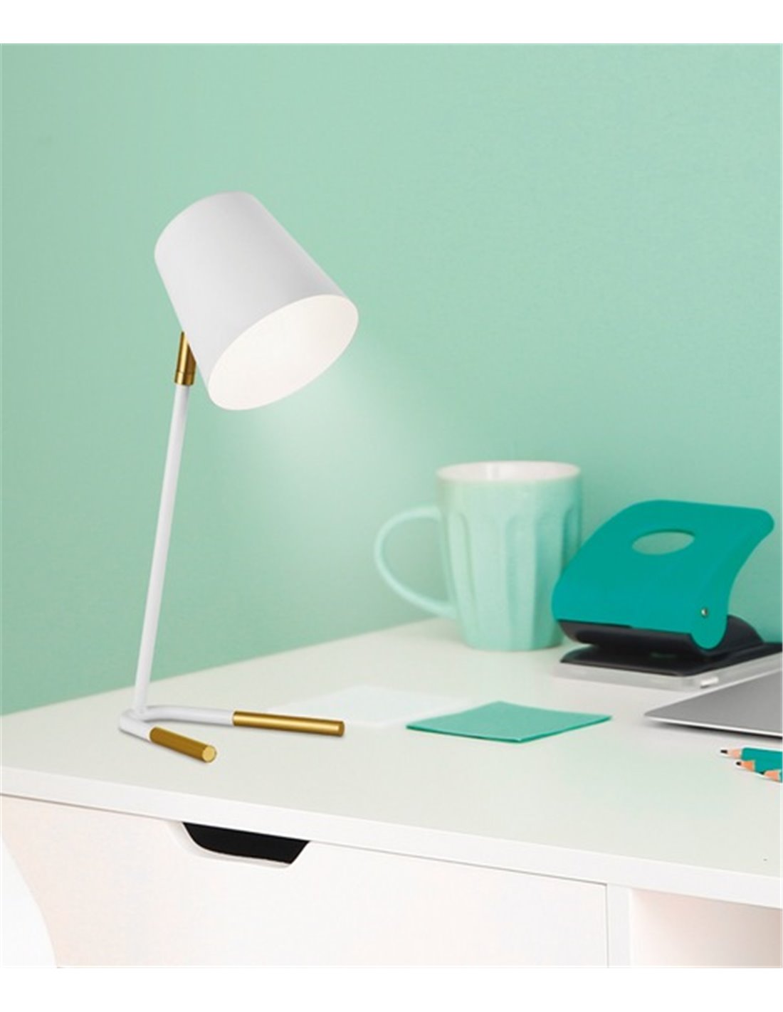 The Dimas table lamp is a stylish and functional option, ideal for bedrooms or workspaces such as desks. Its metal structure is available in black or white finishes, with gold details that add a glamorous touch to its design. Its adjustable head allows you to direct the light where you need it, making it a practical solution for reading or working.
