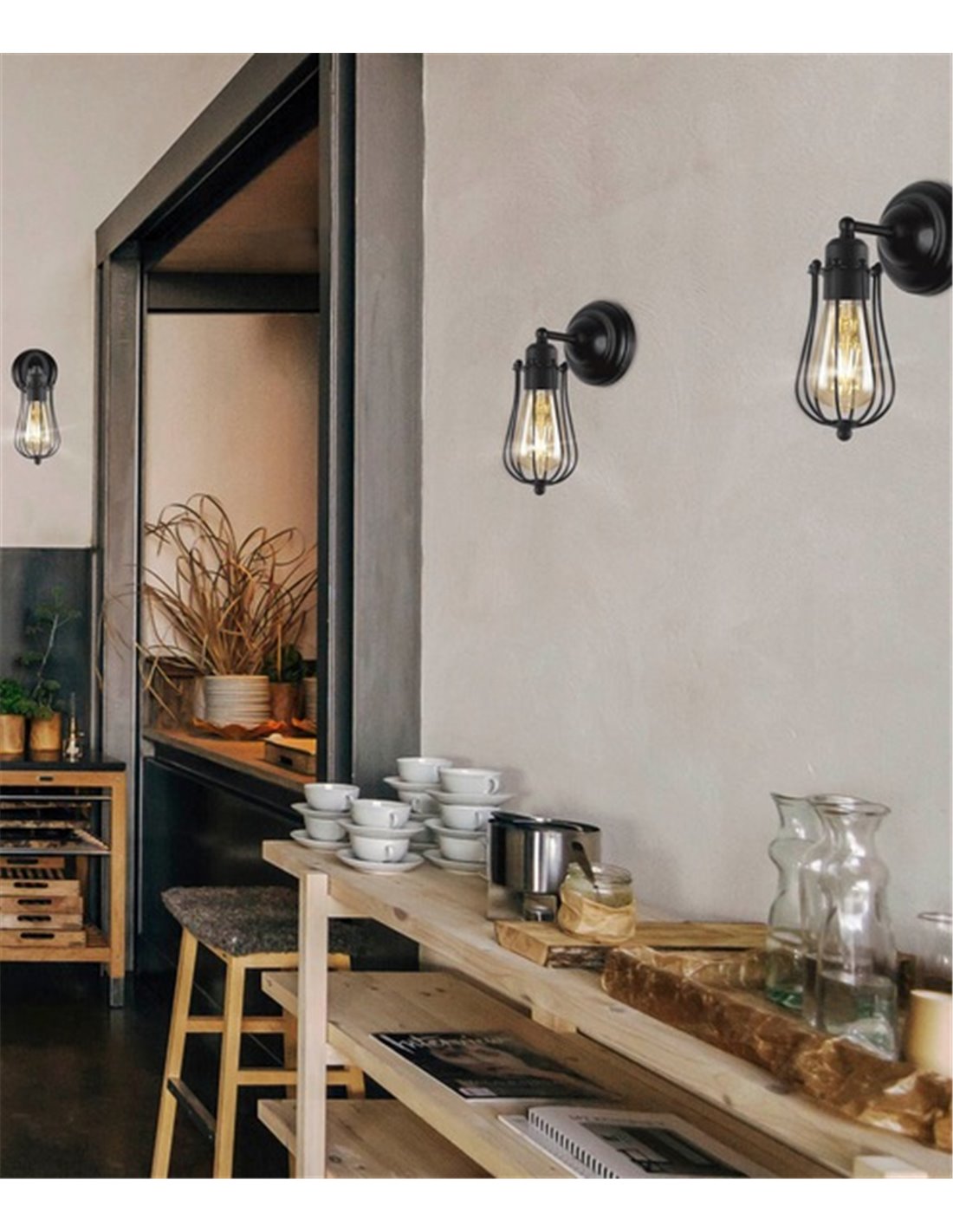 The vintage-style Coke wall light adds character and charm to any space. Its metal design, featuring a black cage-like finish hanging from the base, not only encases the bulb but also protects it, creating an interesting play of light and shadow on the wall.