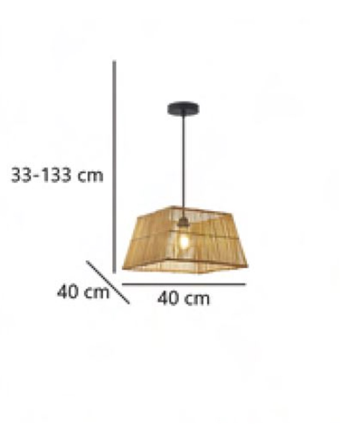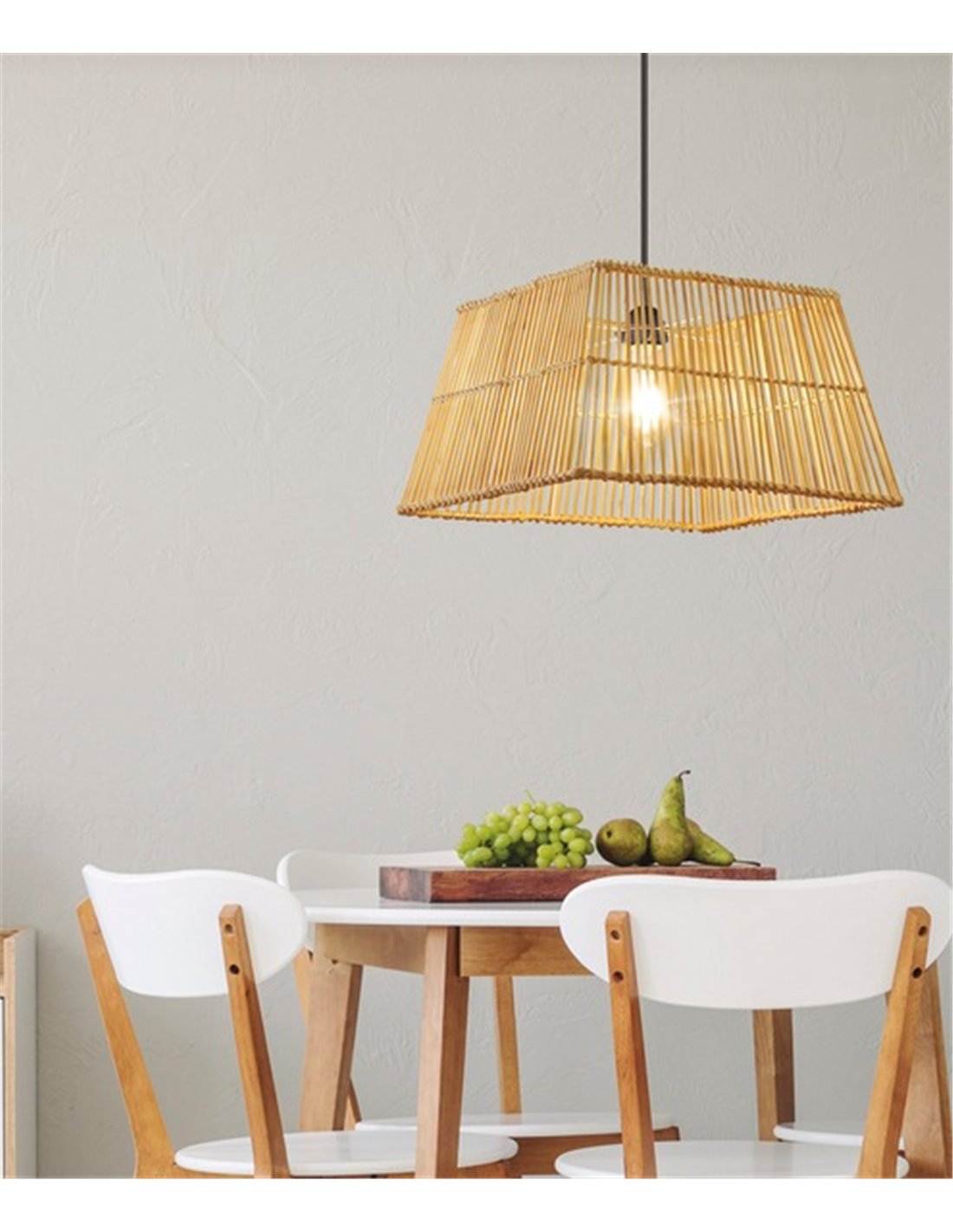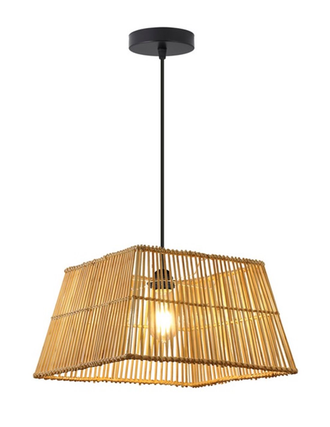 This pendant light stands out for its trapeze-shaped shade, made of natural rattan and a metal frame, giving it a boho-chic aesthetic that blends harmoniously into a variety of spaces.