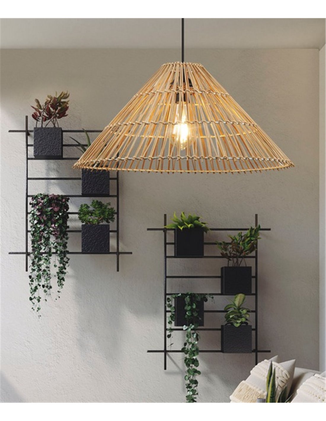 This pendant lamp, with its elegant combination of natural rattan and metal, brings a boho chic style that complements any interior space, from bedrooms to living and dining rooms. The light filtered through the rattan creates a warm and cosy atmosphere, ideal for relaxing or socialising.