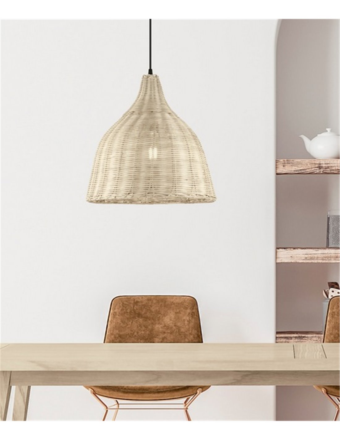 Sacoma stands out for its combination of natural materials, an ideal feature to bring warm and fresh lighting to any space. This pendant light, made of natural-coloured wicker, adds texture and an organic touch to the décor, complemented by a metal structure for durability and stability.
