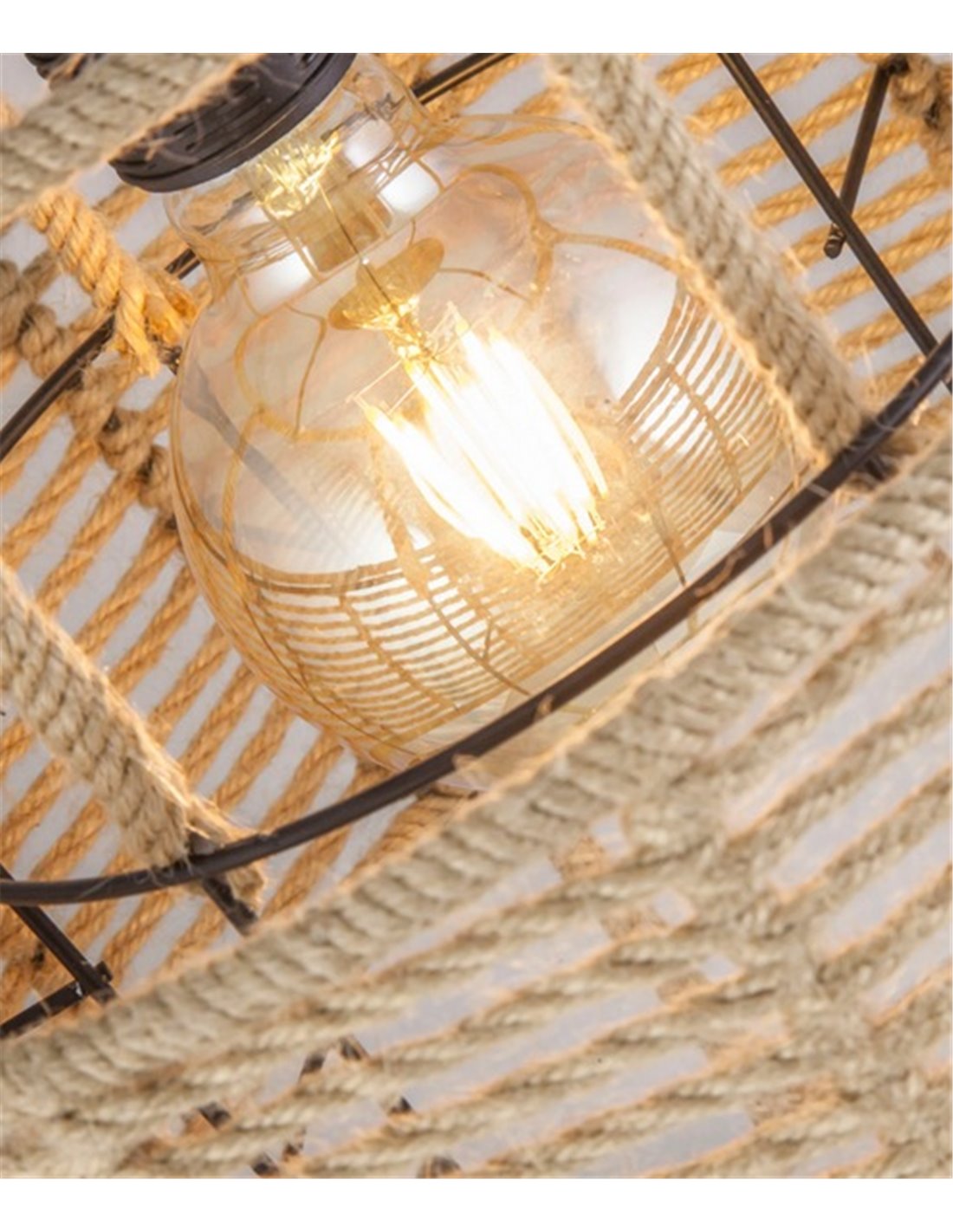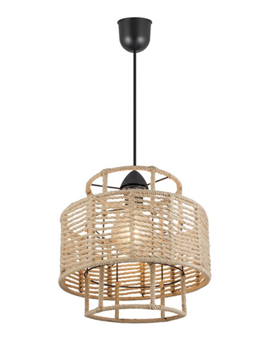 The Aifos lamp is characterised by a black lampshade adorned with interwoven rope, creating a visual contrast. The structure of the lamp, consisting of two overlapping cylinders, plays with geometry, offering a distinctive and contemporary look.