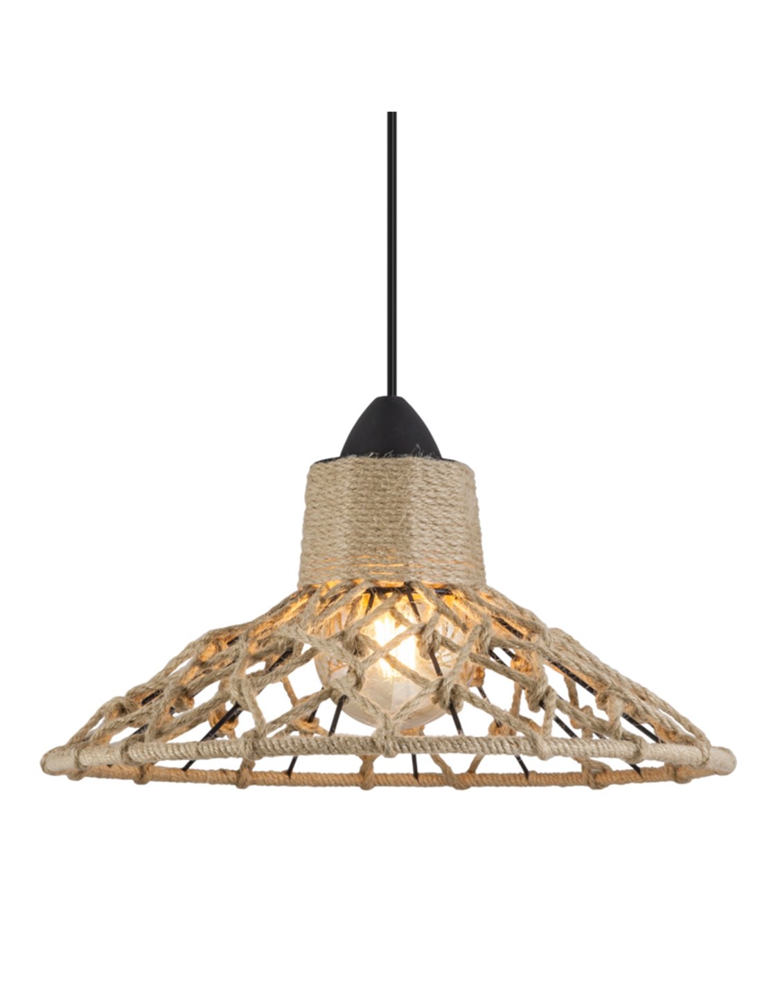 The Korfu ceiling light stands out for its materials such as metal in a black finish and natural rope that is woven around the structure. This simple design allows the lamp to suit a variety of decorative styles, especially in environments that seek to incorporate elements of boho chic style with a natural touch.
