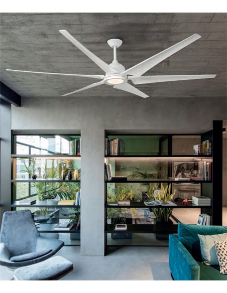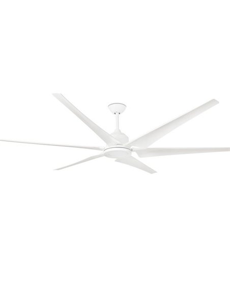 Cies is a modern style six-blade ceiling fan without light, perfect for rooms larger than 28m2. It has an inverse function, which is capable of redistributing the hot air from the heating in winter, while maintaining its traditional function in summer, providing fresh and pleasant air. It is made of steel, with abs blades, in white and diffuser also made of ABS. It is operated by means of a remote control, which is incorporated and also has a SMART version, which allows it to be operated by means of the WiZ application, developing the same functions as the remote control (compatible with Google Assistant, Siri and Alexa). This fan includes the possibility of being installed on sloping ceilings. It has 5 adjustable speeds with a consumption of 6-9-15-28-44W and 54-67-79-98-112 revolutions per minute depending on speed.