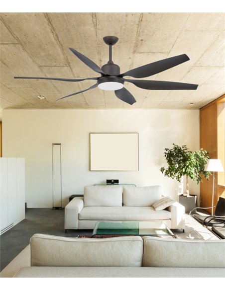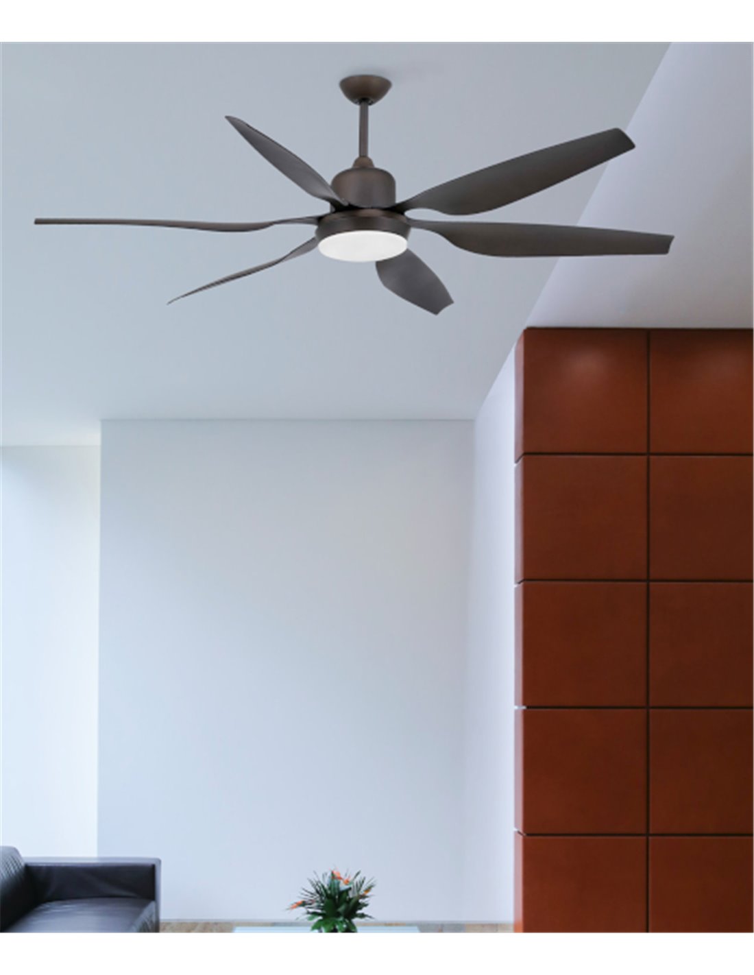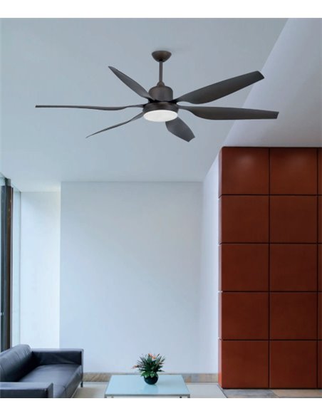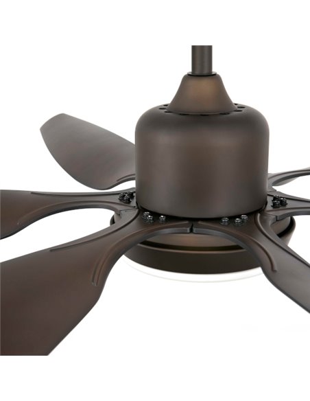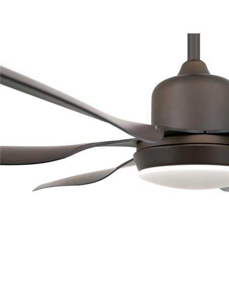 Tilos is a steel fan with six aerodynamic blades from the Faro Barcelona brand. This model is ideal for rooms of 17.6m2 or larger. It has a motor made of steel and ABS blades in a brown finish. This model is operated by means of a remote control, which is incorporated. This fan is very versatile, as it is designed to be installed in different rooms, and is also suitable for sloping ceilings. It also has a reverse function, which makes it perfect for both summer and winter use. It also has a DC motor, which guarantees great savings in consumption. Tilos has 6 speeds which are summarised in the following characteristics (in consumption and revolutions per minute): 4-6-9-14-21-35W / 31-43-55-67-78-95rpm.