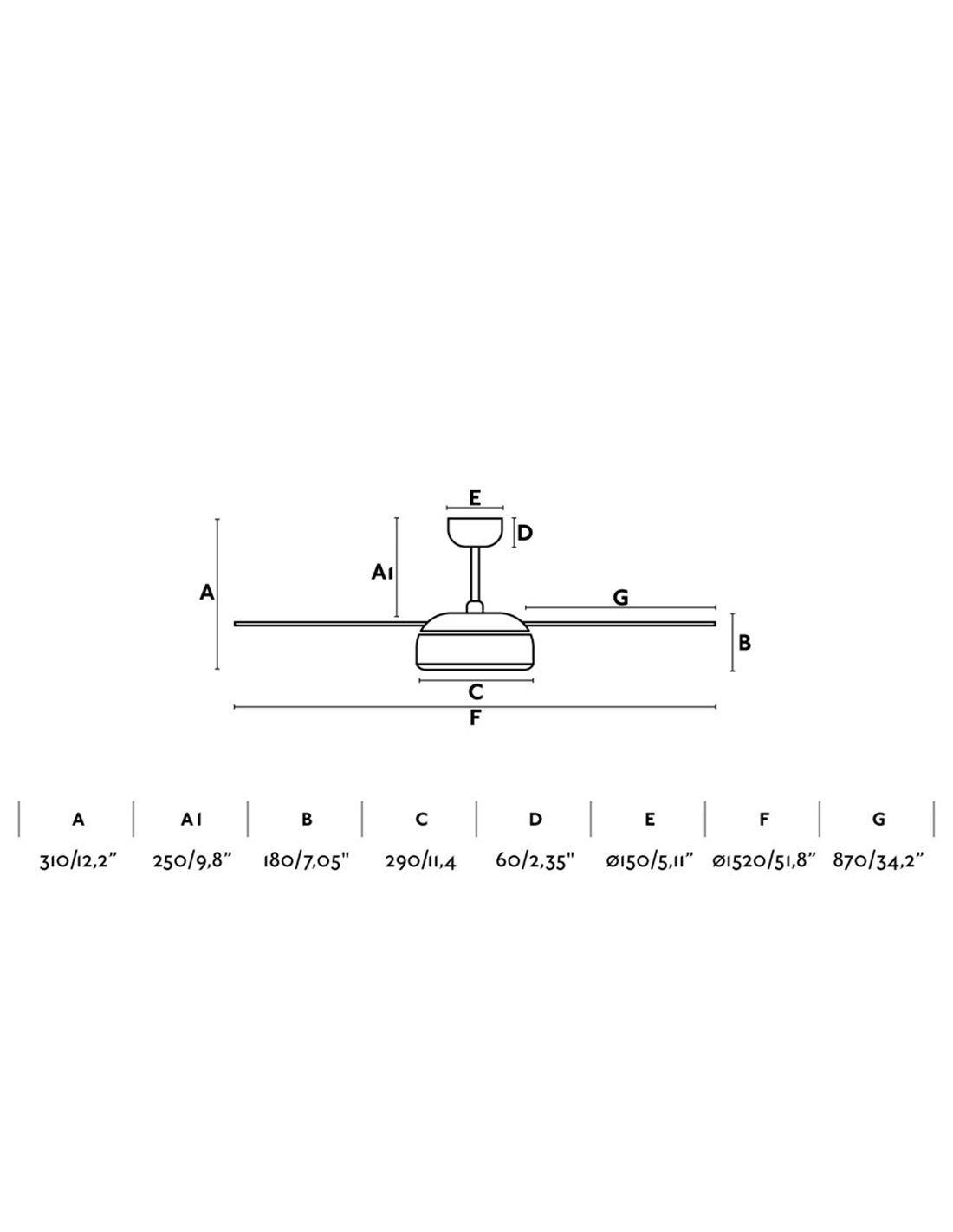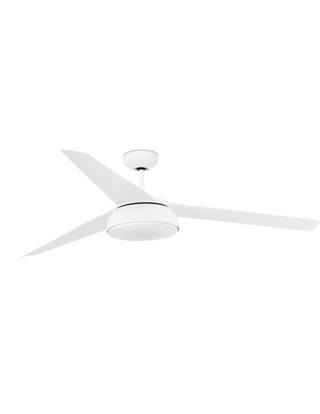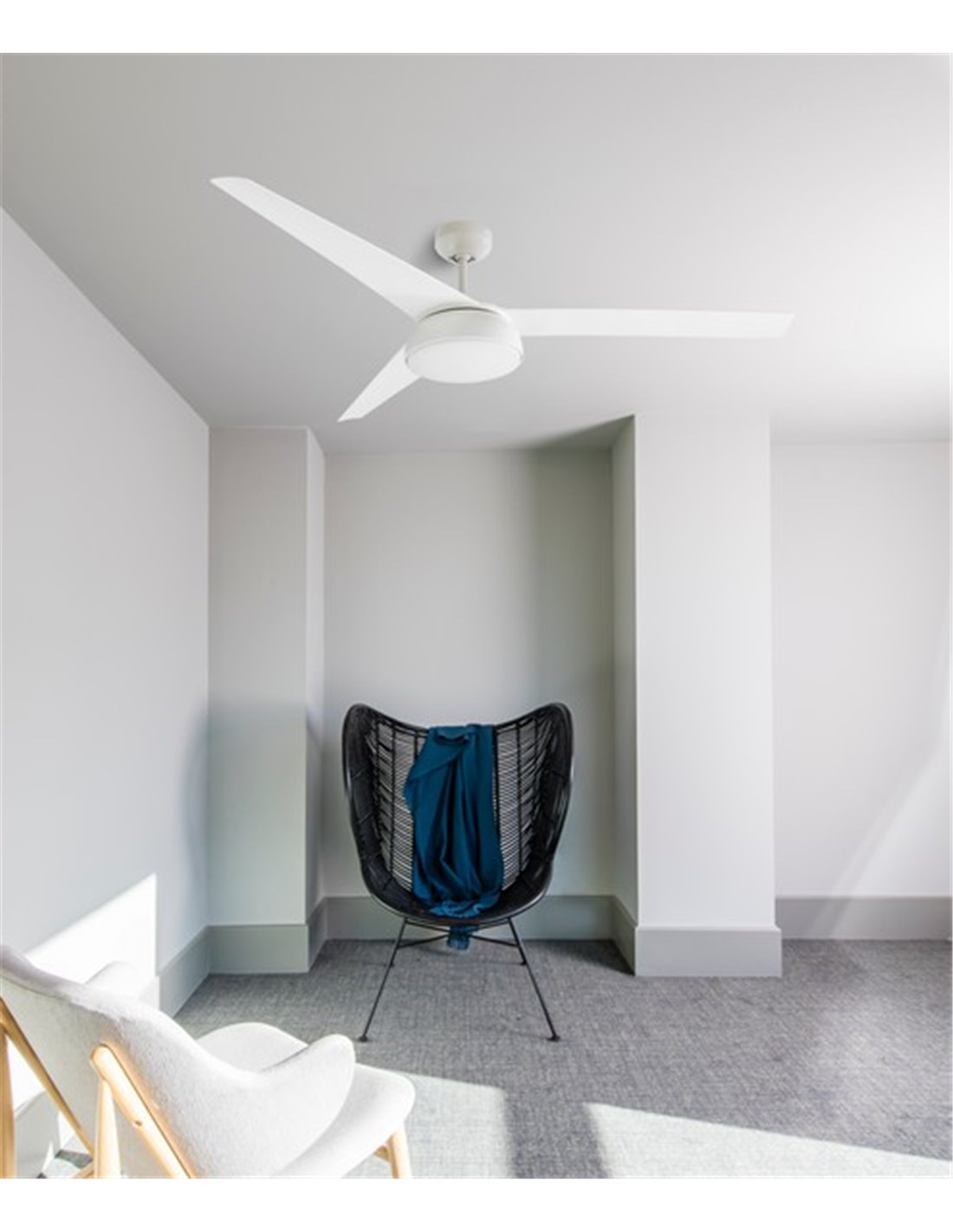 We present Vulcano, a white ceiling fan from the Faro brand with a modern style, perfect for rooms of 17.6m2 or larger. With a steel motor and ABS blades finished in white, it has an airflow of 189.01 m3 min / 6675 CFM. It is operated by remote control, which is built-in, and has a reverse function, which means that its blades can also rotate in the opposite direction to the way they usually do for cooling, which is also ideal for winter. It is possible to install it on sloping roofs. It has a DC motor, which guarantees considerable savings in energy consumption. Vulcano includes a SMD LED light source with 25W warm and dimmable light. It has 6 speeds with the following characteristics in terms of revolutions per minute and consumption: 6-9-13-18-20-27W / 80-106-127-147-161-181 rpm. This fan includes SMART function, which allows you to control it from anywhere in your home using the WiZ application, performing the same functions as the remote control. (Compatible with Google Assistant, Siri and Alexa).