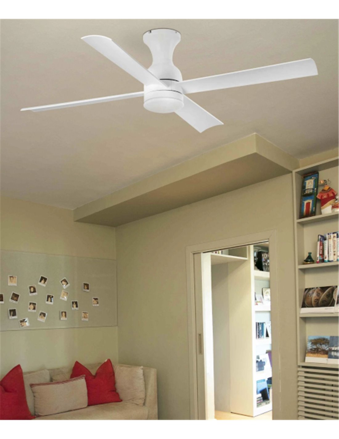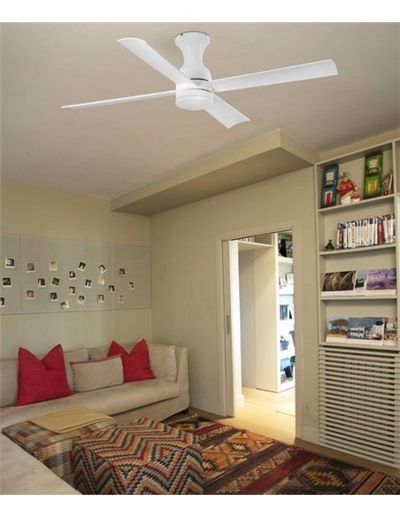 The Fraser fan with light is a fan with modern lines, perfect for rooms between 13m2 and 17.6m2, with a steel body and ABS blades in a white finish. This product is switched on and off by means of a remote control with programmer, which can also be used to control its five speeds, which have the following characteristics (in terms of consumption and revolutions per minute): 7-10-13-19-25-25-33W / 95-112-129-146-163-180 rpm. It can be used all year round thanks to the winter mode that offers an even distribution of warm air and the traditional summer mode that provides fresh and pleasant air. It also includes a direct current (DC) motor, which guarantees up to 70% more savings compared to conventional fans. It includes a dimmable SMD LED light source of 3000K (warm light), 850lm.
