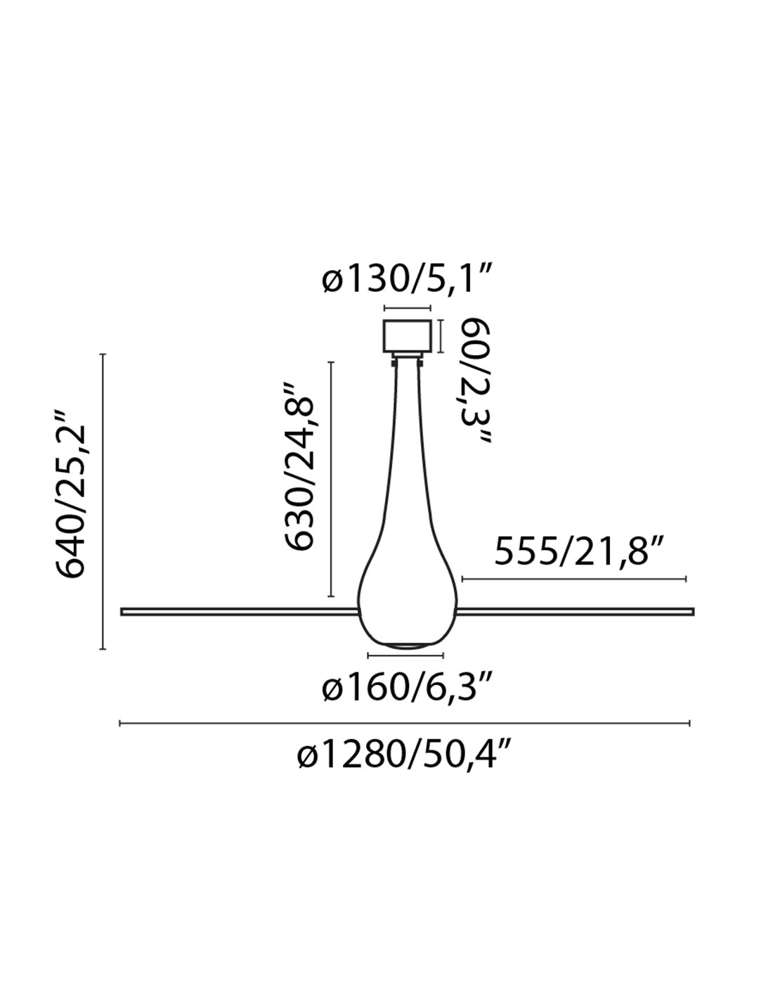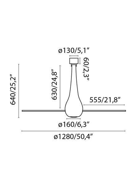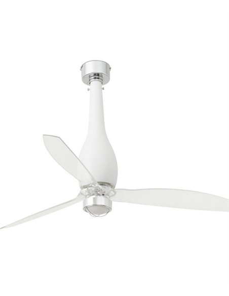 This is the lighted version of Eterfan, which is a ceiling fan with a DC motor with modern lines and a very modern industrial design. This fan includes the light source (SMD LED 16W 3000K 709Lm) and given its size (128 cm diameter) and its airflow: 145,66 m3 min / 5144 CFM it is recommended for rooms with surfaces from 13 m2 to 17.6 m2. It has three pc blades (plastic material) and its structure is made of steel and transparent glass. This ceiling fan is operated by remote control, included. It has 6 adjustable speeds with the following characteristics according to speed. 1st speed: 51 rpm -4W 2nd speed: 77 rpm - 6W 3rd speed: 103 rpm - 9W 4th speed: 129 rpm -13W 5th speed: 155 rpm - 22W 6th speed: 185 rpm - 32W This fan has an inverse summer-winter function so that we can enjoy it both in warmer and colder seasons when it would help to distribute the air from the heating. It is available in 8 different finishes: - Transparent glass - Glossy white - Matt white - Gloss black - Matt black - Wood - Red - Black