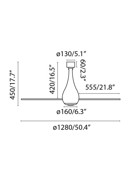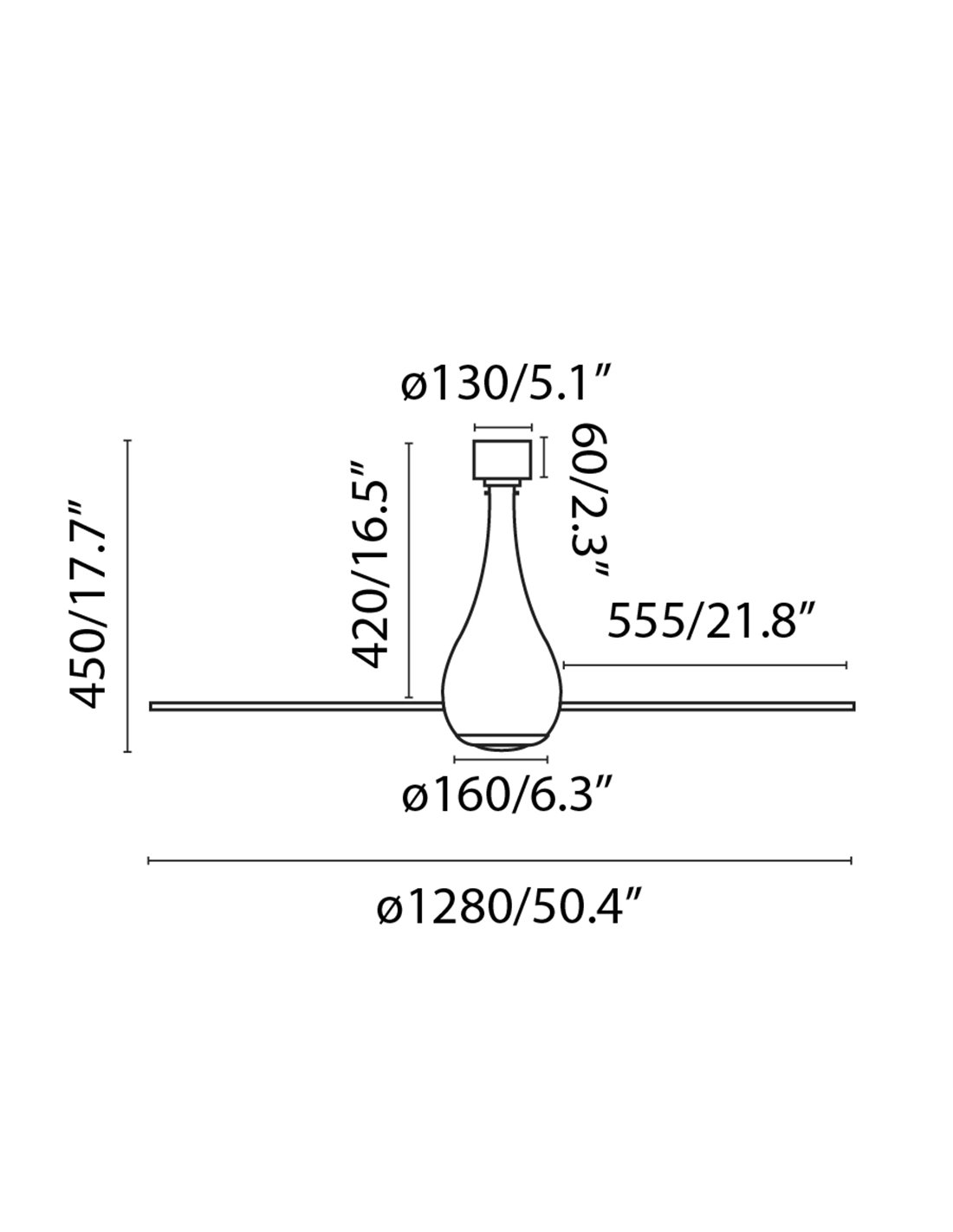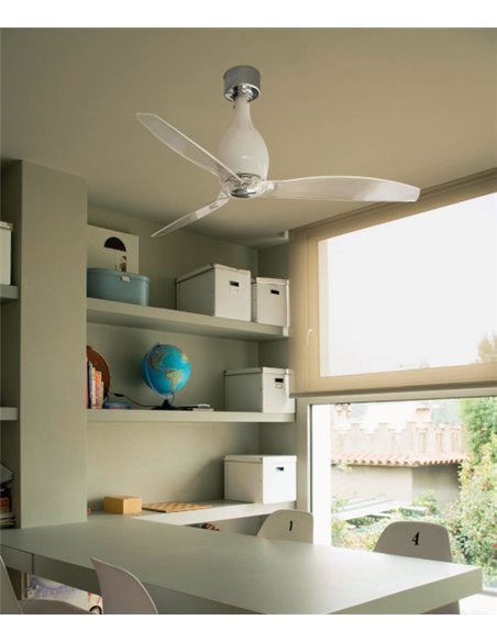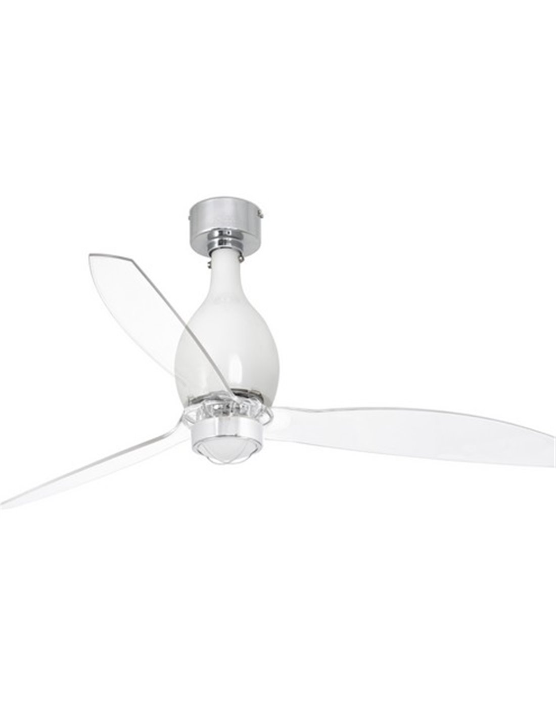 Mini Eterfan is available in versions with and without light. The first option includes a 16W, 3000K, 709Lm, SMD LED light source, providing a warm and cosy light. The fan design combines metal and clear glass with clear PC blades, offering a sleek modern look that is complemented by a variety of finishes such as clear glass, gloss white, matt white, gloss black, gloss black, matt black, wood, red and full black.