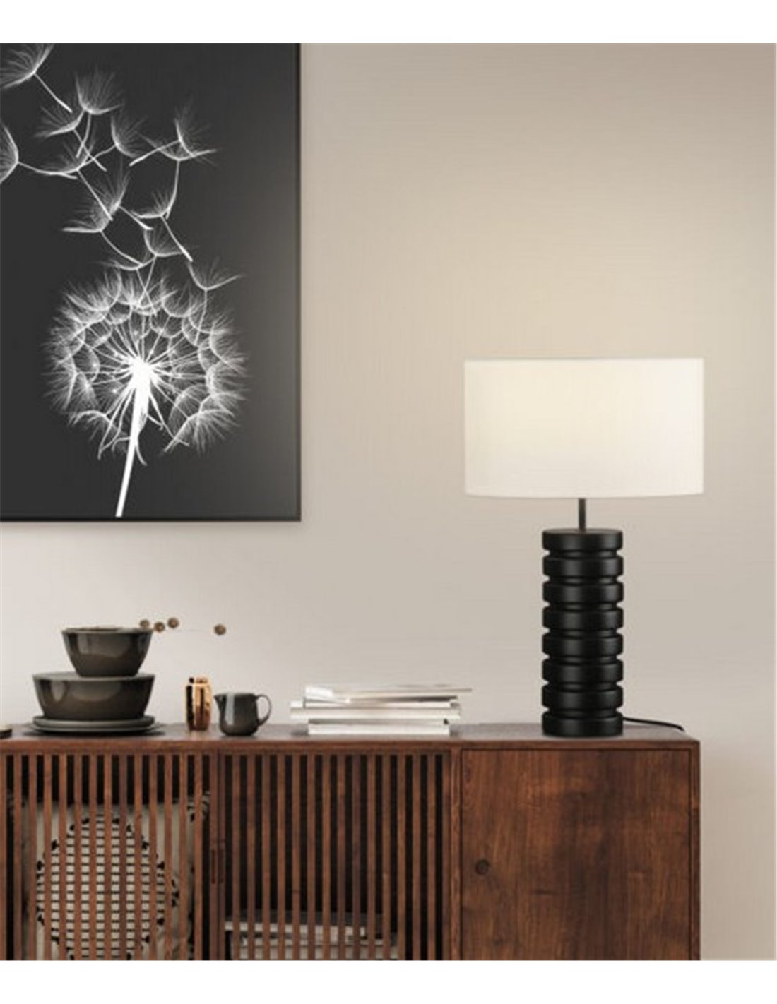 Sharm is a unique piece, carefully crafted with resin in black finish in its structure and a cotton shade. It presents a very elegant and refined shape to give the space a trendy point. Sharm has a traditional yet modern style, and measures 40 cm in diameter in its lampshade, 64.3 cm in height and 14 cm in diameter at its base. Thanks to its IP20 protection rating and its features, Sharm is perfect for lighting rooms such as bedrooms or living rooms. Light source (not included): E27 LED.