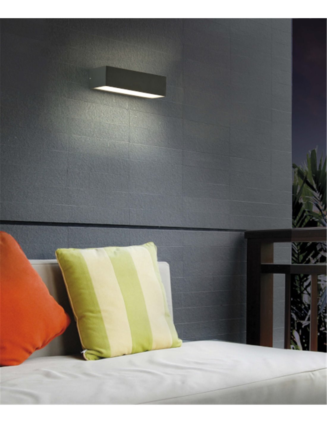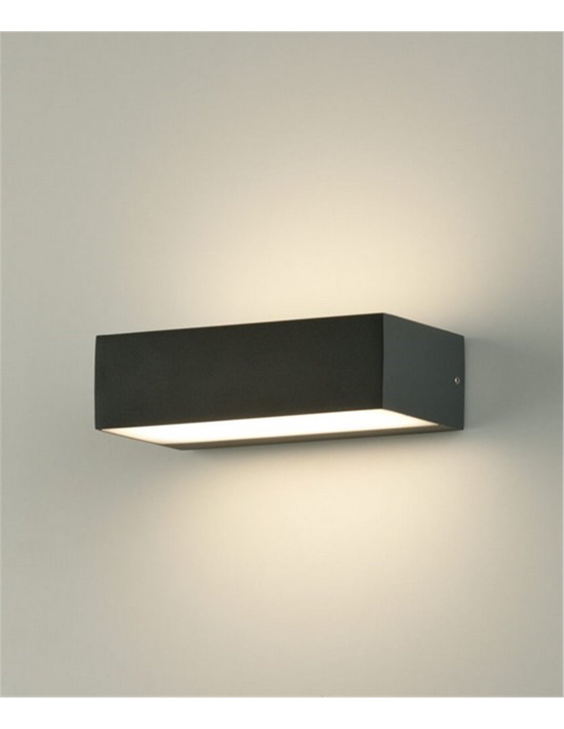 The outdoor wall light Draco, by ACB Iluminación, has been designed to illuminate outdoor areas such as porches, terraces or balconies in a practical way due to its IP54 protection which makes it very resistant to dust and water ingress. Draco is made of aluminium and polycarbonate, and has a rectangular shape, as well as a minimalist, simple and elegant design. This outdoor light emits indirect light, and has an LED light source with 5W power, 510 lumens and a warm light temperature (3000K). It measures 6 cm high, 20.7 cm long and 11 cm wide and has an anthracite finish.