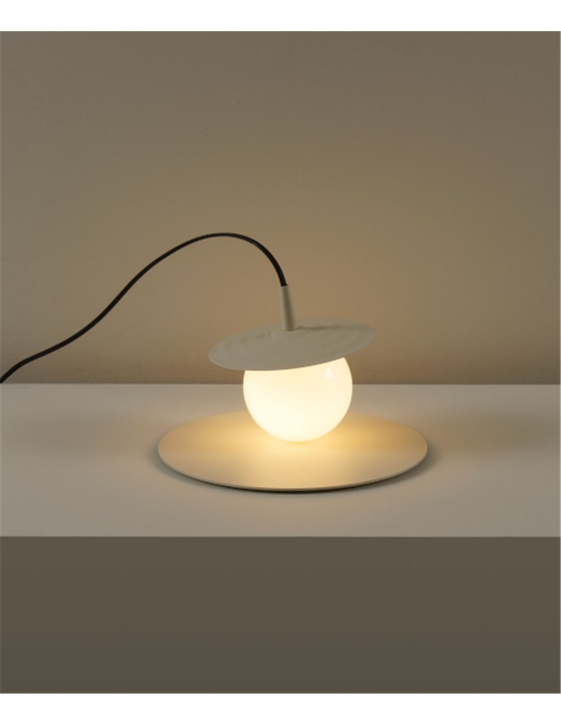 The design features an opal blown glass ball shade with a glitter finish, which sits on an injection-moulded polycarbonate support. The glass shade is fixed by a magnetisation system, including a spherical neodymium magnet inside, allowing a rotation of up to 125º. This feature enables dynamic direction of the light, changing the orientation of the lighting as desired.