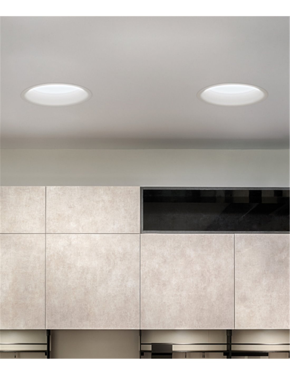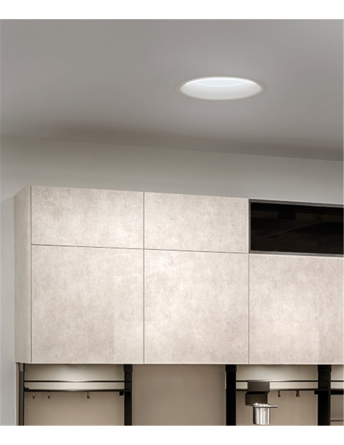 When the light is switched on, the Drop lighting creates an effect that blurs the boundaries of the luminaire with its brightness. The lighting effect of this downlight resembles that of a natural skylight. This is the largest version of the Drop collection, consisting of white downlights.