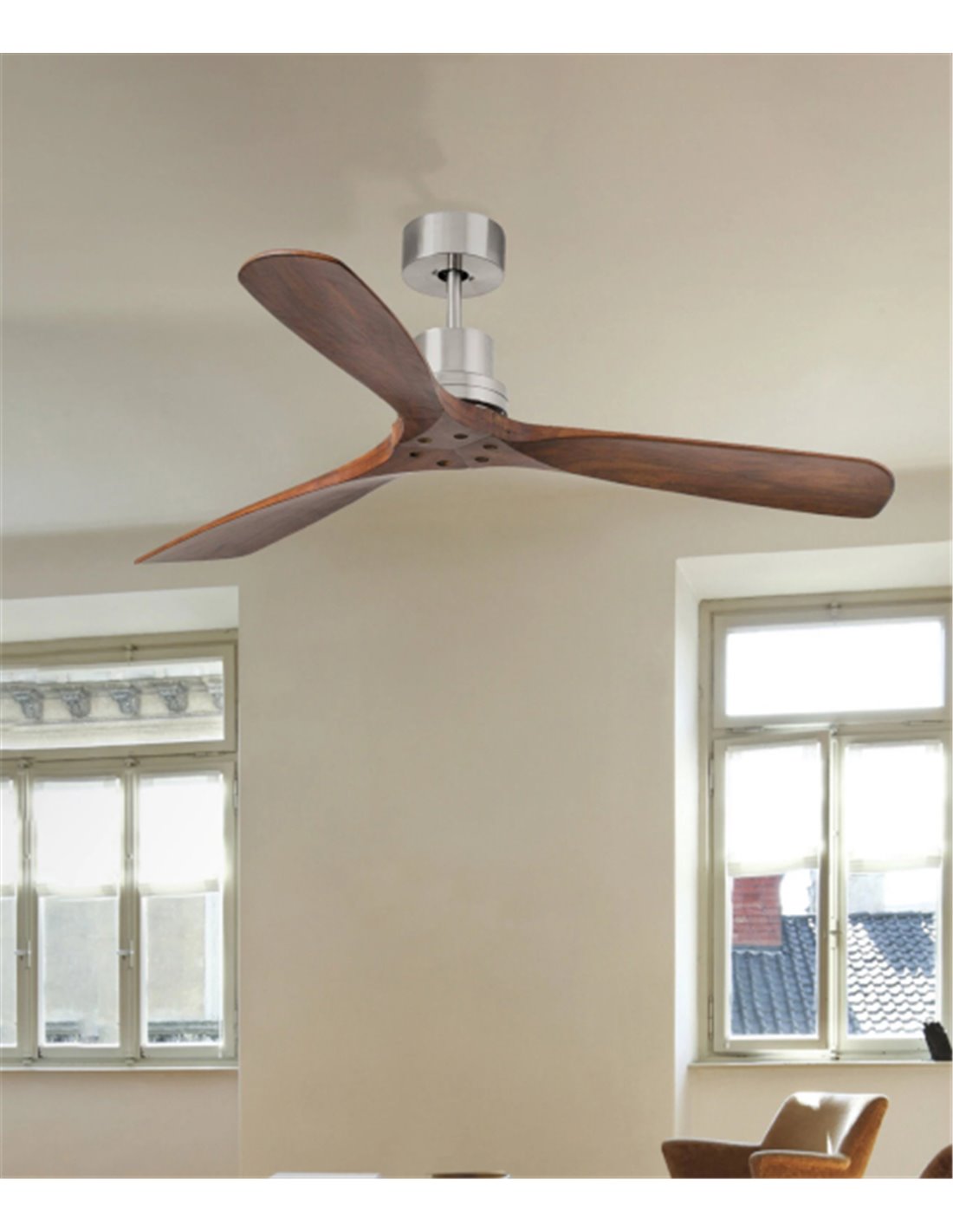 Lantau is a modern ceiling fan designed for contemporary rooms of 17.6 m² or larger. It features a steel motor and three wooden blades available in two finishes: dark walnut or pine. This ceiling fan, which does not include a light, is operated by an included remote control.